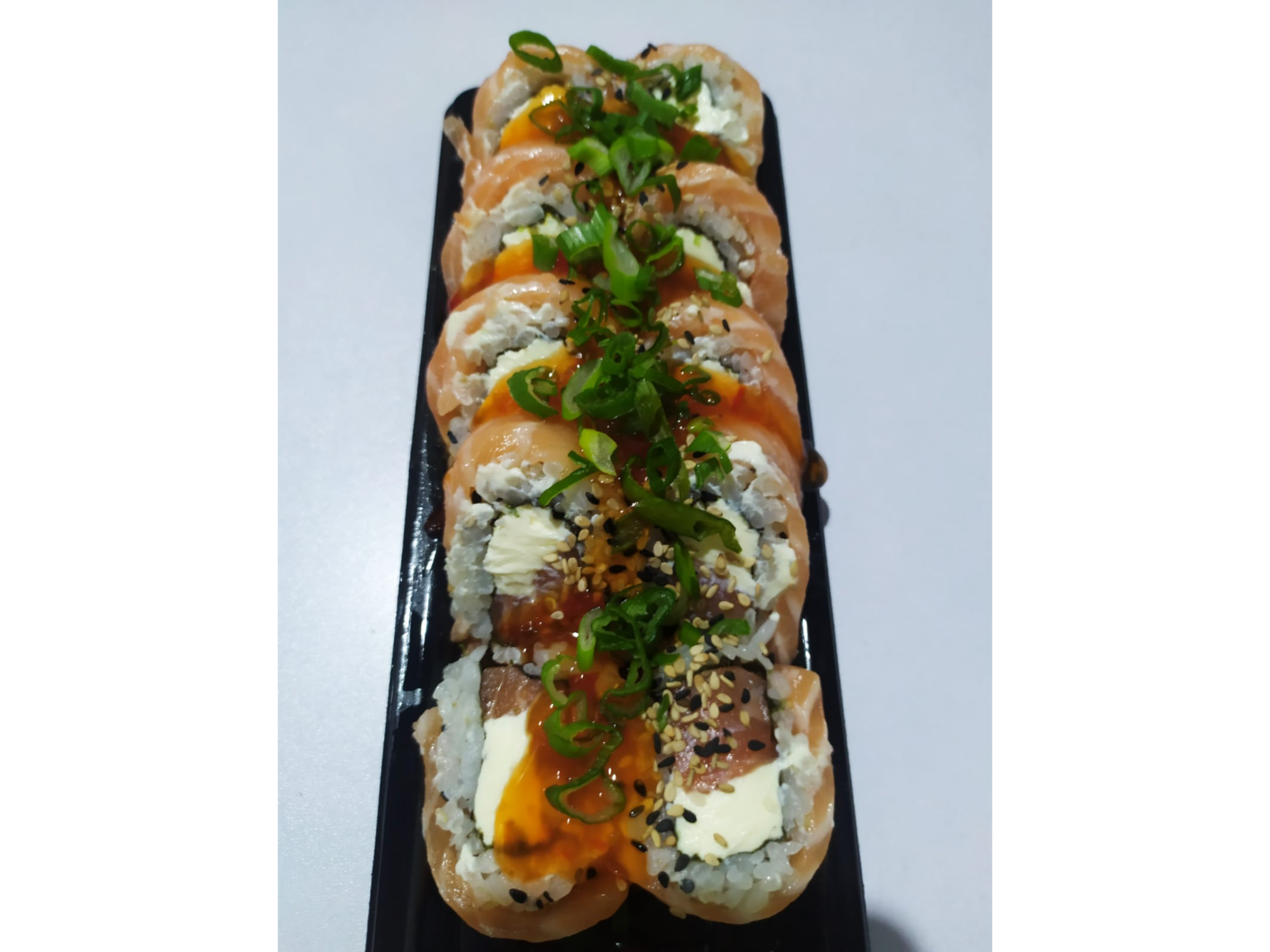 Uramaki Dragon 10 PiezasAlga, Arroz, Crema cheese, Salmão, semillas de sésamo y por afuera Tiras de salmón. Con verdeo y Salsa Sweet Chilli.$11.385 Observaciones 0 / 150
