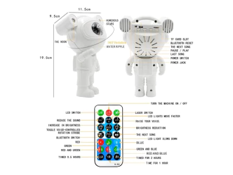 Proyector decorativo con diseño de astronauta que combina iluminación LED con efectos de nebulosa en movimiento y parlante Bluetooth integrado. Permite proyectar luces multicolores con orientación ajustable mediante giro de 360°, creando un ambiente visual relajante en dormitorios o espacios interiores. El sonido se reproduce de forma inalámbrica desde dispositivos compatibles. Los efectos de luz pueden controlarse desde el equipo o mediante control remoto incluido.
