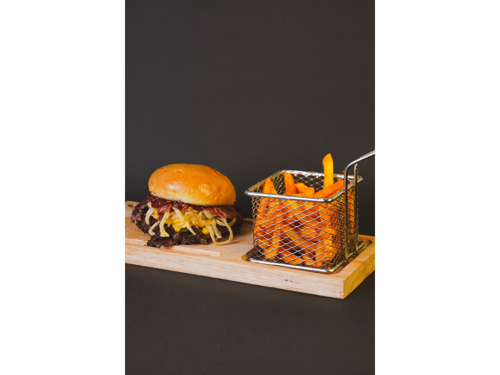 Medallón smash de 110g, doble cheddar, bacon, cebolla crispy y salsa bbq. Incluye papas fritas.