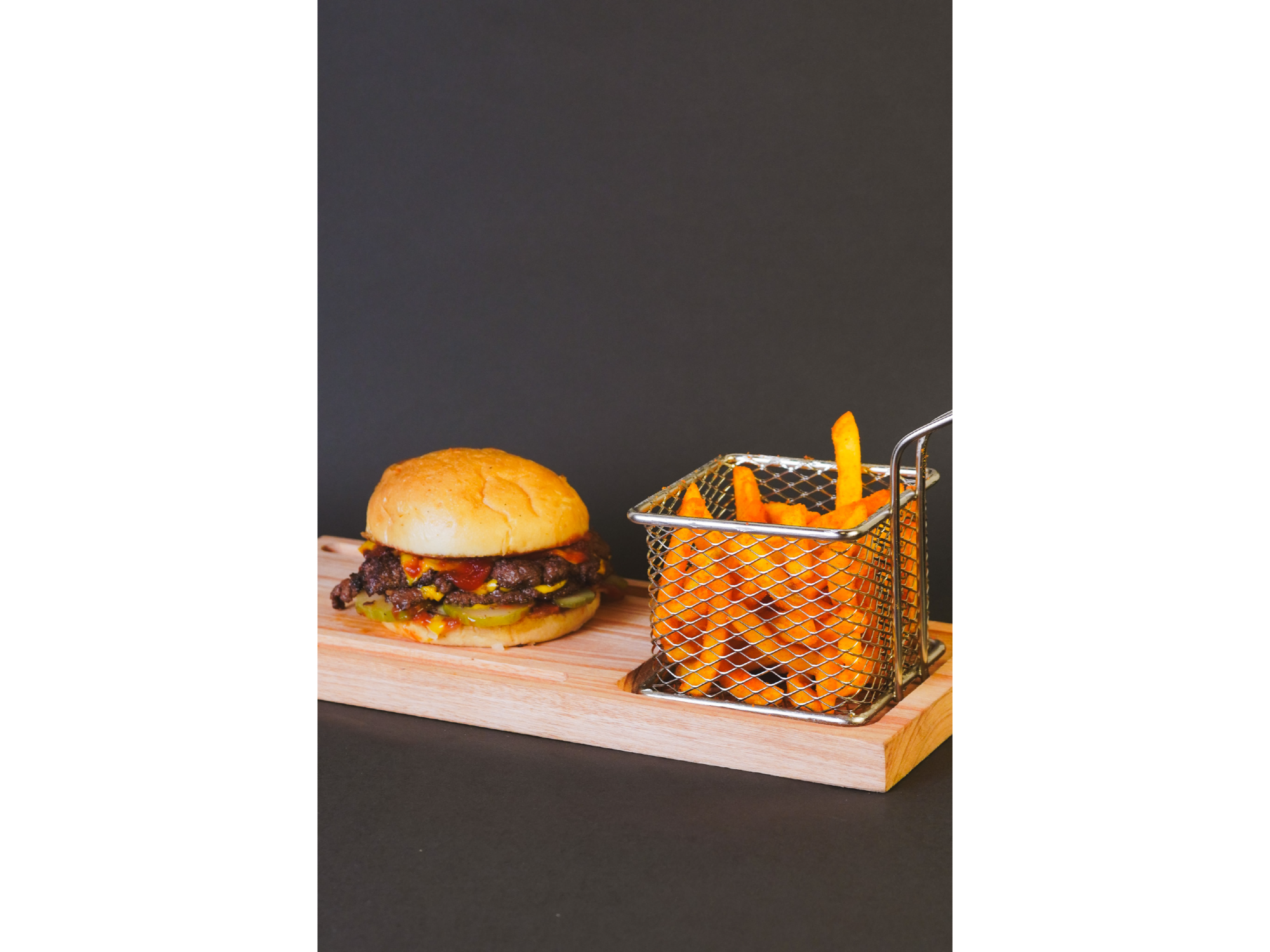 Medallón smash de 110g, doble cheddar, cebolla brunoise, pepinillos, ketchup y mostaza. Incluye papas fritas.