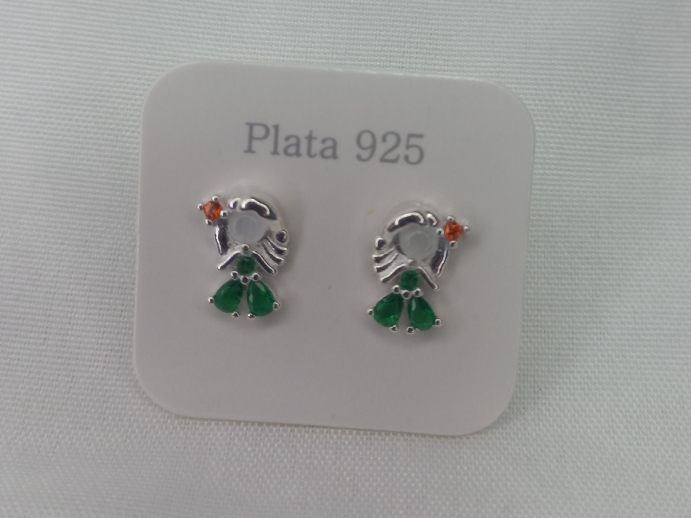 APC17 Compartir Aros pasantes plata italiana 925. Tienen forma de princesa, con vestido realizado en cúbics verdes, carita de perla sintética esmerilada y cúbic naranja fuego en el cabello. Únicos. Cierre mariposa$0 Observaciones 0 / 150