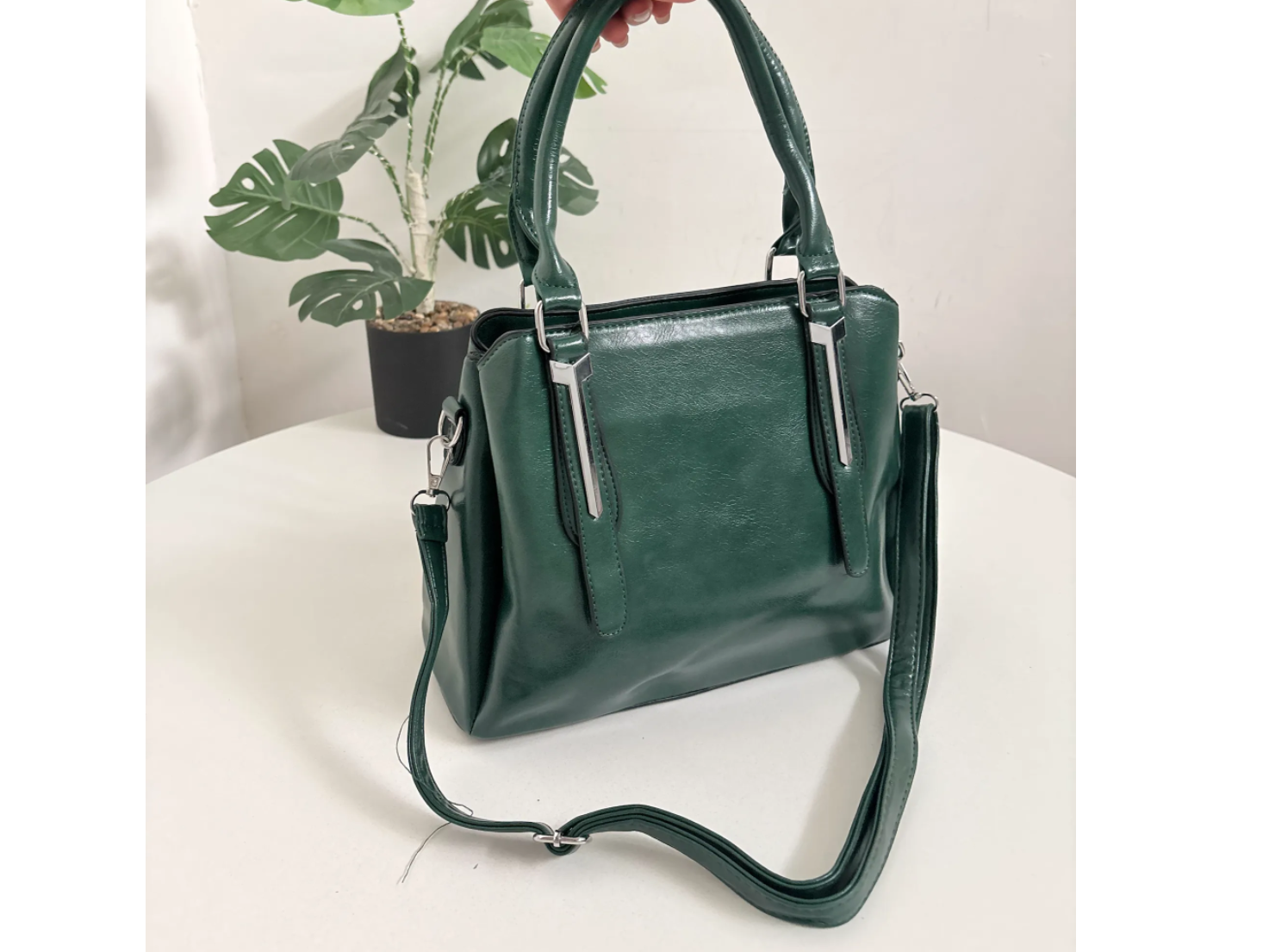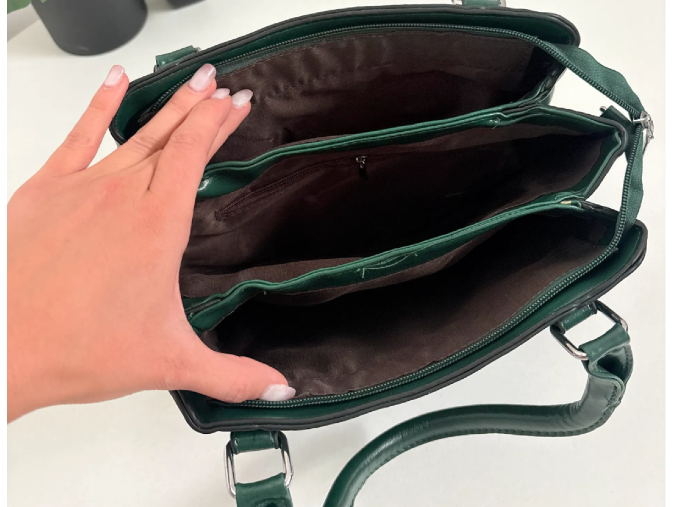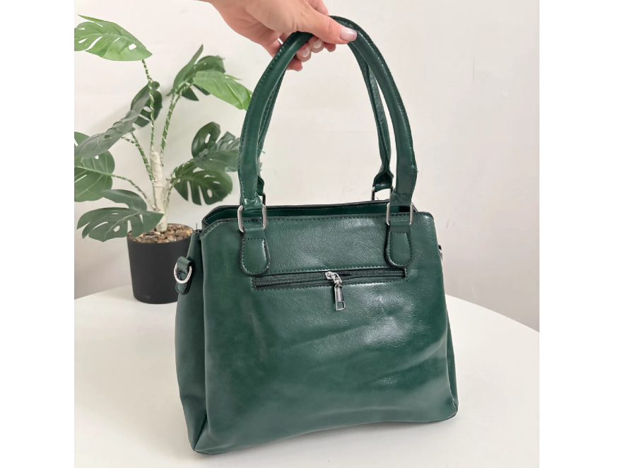 Bah color verde inglés y acabado lustroso. Elaborada en ecocuero de primera calidad. Está íntegramente forrada en el interior.