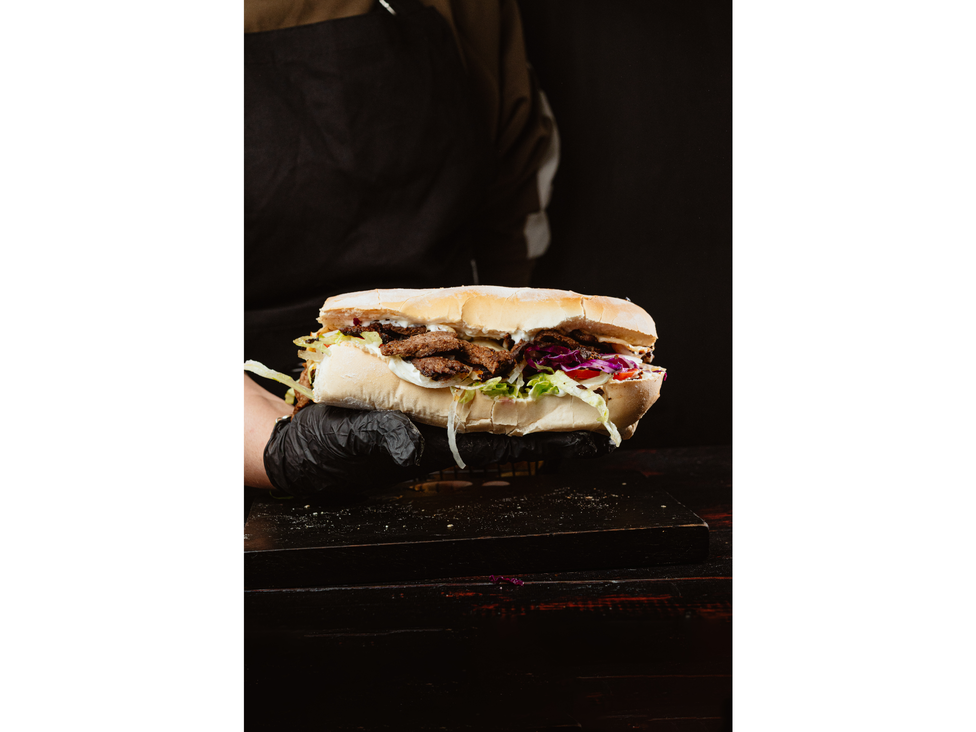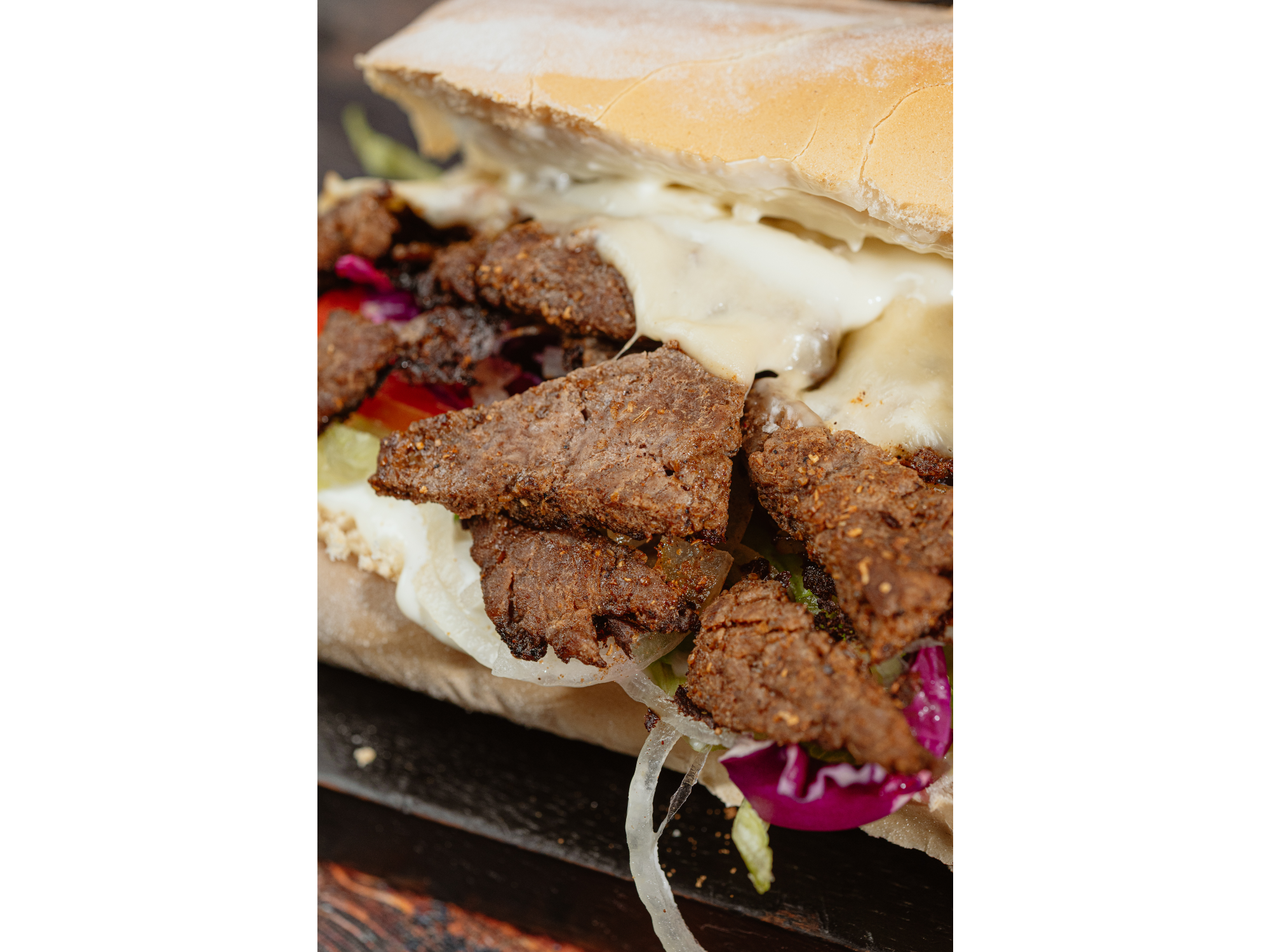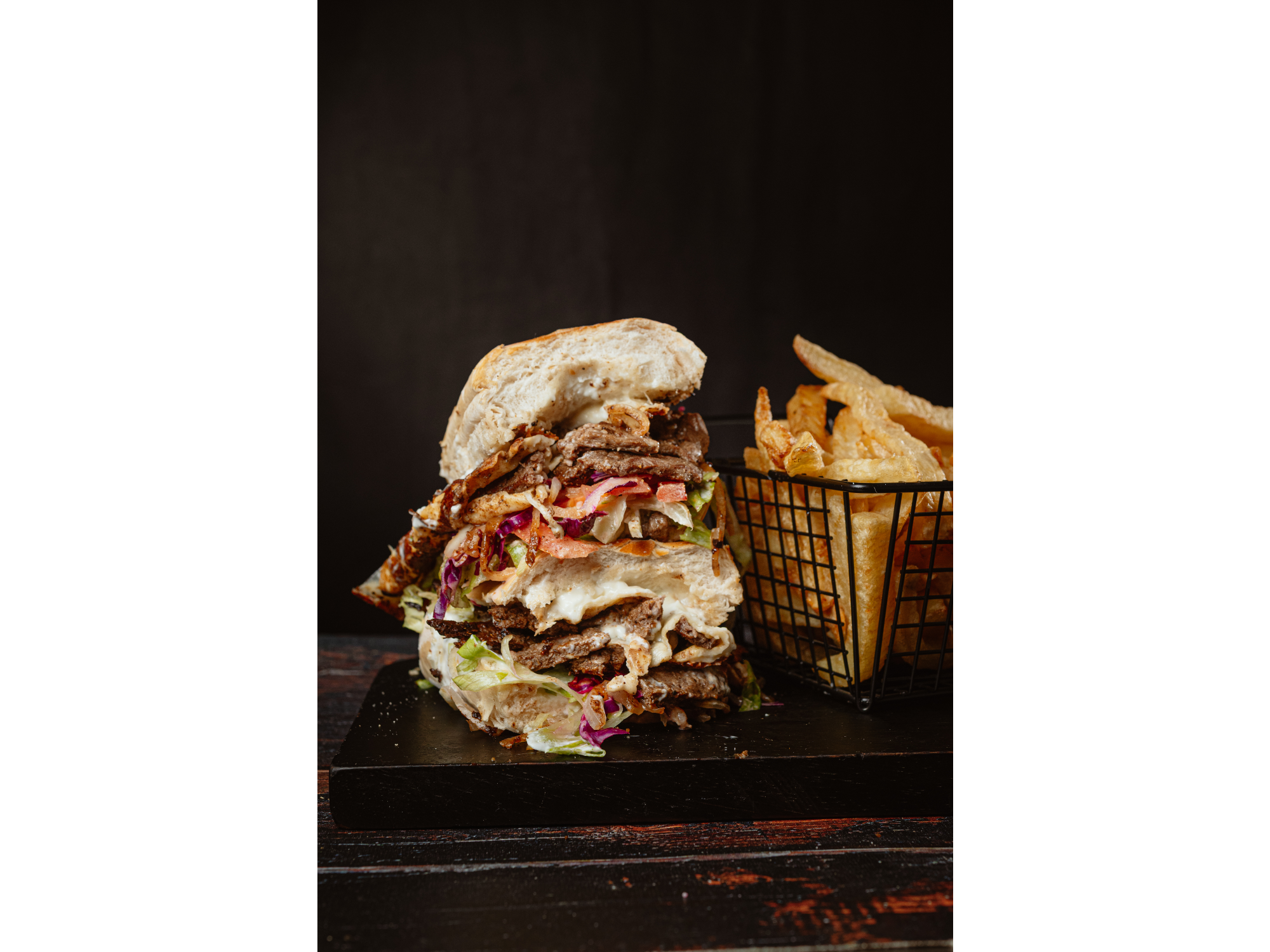 *Pan arabe artesanal*, mayo (de la casa, de ajo o Natura a eleccion), lechuga repollada, tomate, *repollo morado, cebolla maceradas en limon, carne de Nalga de ternera cortada a cuchillo y macerada en limon, vinagre, Baharat (especia arabe)*, *DOBLE* queso tybo, **PAPAS CHICAS*