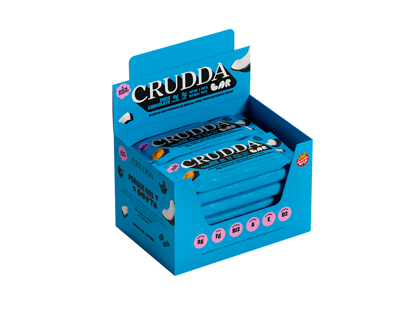 CRUDDA COCO CHOCOLATE - 10 barritas. ¿Buscas una opción saludable y deliciosa? Estas barritas, elaboradas con proteína de arveja, ofrecen un sabor irresistible que combina la suavidad del coco, la intensidad del chocolate y la cremosidad de la pasta de maní.