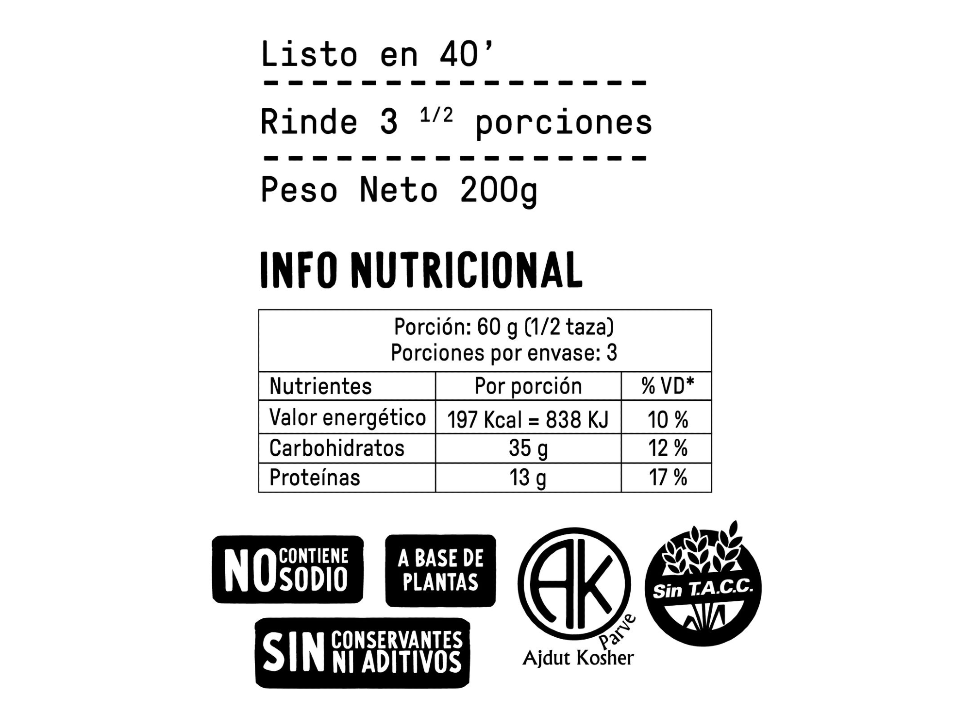 Fáciles de cocinar, sabrosas y rinden 2 o 3 porciones. No tienen conservantes, ni aditivos, ni sal. Tienen alto contenido de fibra alimentaria y son aptos veganos.