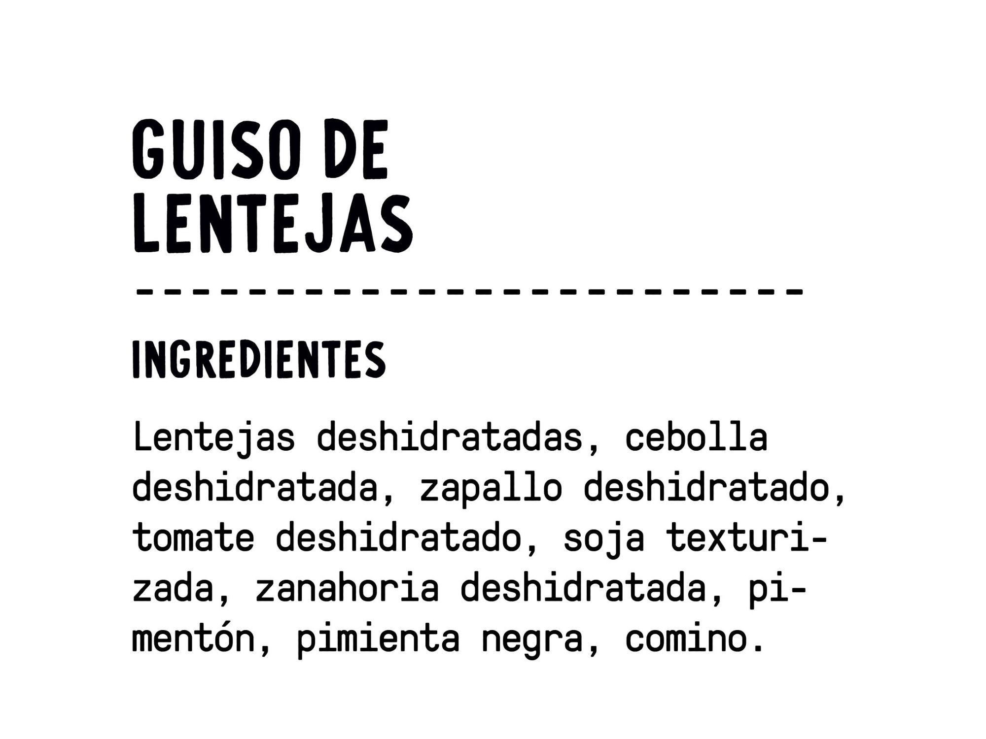 INGREDIENTES:Lentejas deshidratadas, cebolla deshidratada, zapallo deshidratado, tomate deshidratado, soja texturizada, zanahoria deshidratada, pimentón, pimienta negra, comino.