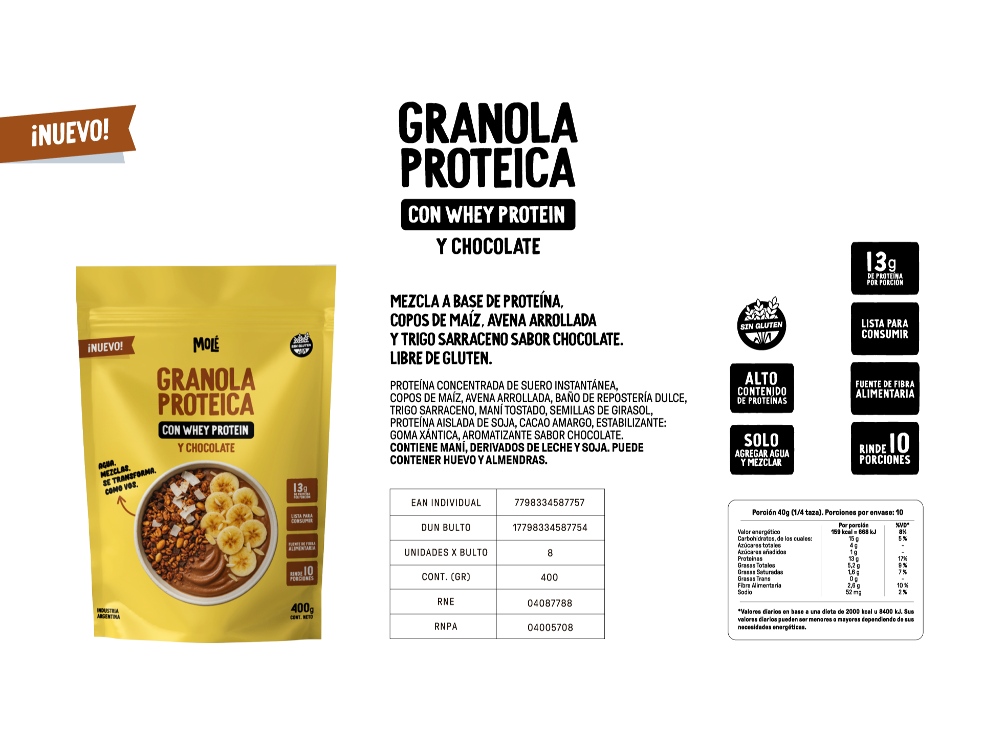 Granola Proteica Chocolate - 400g Compartir por WhatsApp Copiar enlace Granola Proteica con Whey Protein y Chocolate / Cont. Neto: 400 gr LISTA PARA CONSUMIR FUENTE DE FIBRA ALIMENTARIA RINDE 10 PORCIONES ALTO CONTENIDO DE PROTEÍNAS SOLO AGREGAR AGUA Y MEZCLAR SIN TACC$15.919 Observaciones 0 / 150