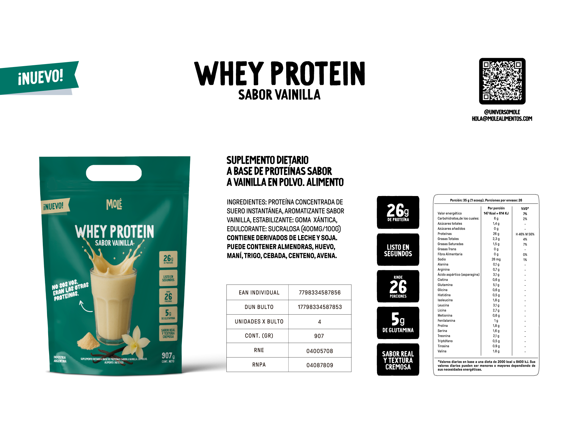 WHEY PROTEIN VAINILLA / Cont. Neto: 907 gr. INGREDIENTES: Proteína concentrada de suero instantánea, aromatizante sabor vainilla, estabilizante (goma xántica), y edulcorante (sucralosa) (400mg/100g)