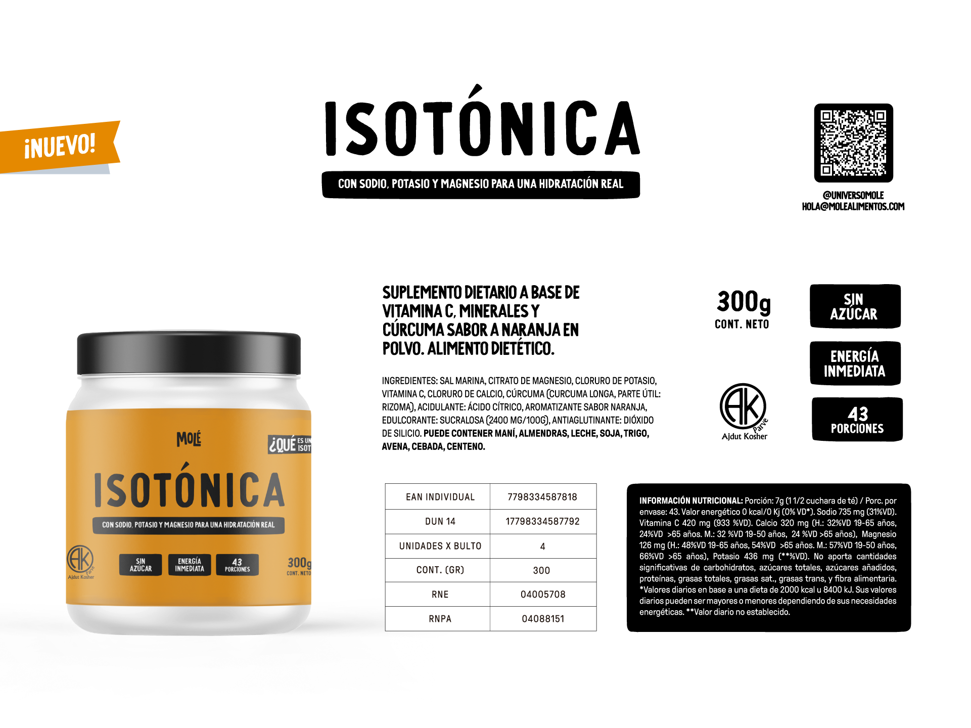 Isotónica / Cont. Neto: 300 gr SABOR NARANJA 43 PORCIONES SIN AZÚCAR CON SODIO, POTASIO Y MAGNESIO PARA UNA HIDRATACIÓN REAL. ENERGÍA INMEDIATA. MODO DE USO: Disolver una medida al ras (7gr.) en 500 cc de agua y consumir. Es recomendable ingerir antes y durante la actividad física. Una isotónica no es solo para cuando transpiras a chorros o corrés 10 km. Es para cualquiera que quiera sentirse más vital, con energía estable y sin el bajón que deja el calor o el esfuerzo. Tu cuerpo pierde agua y minerales TODO el tiempo. Una isotónica repone lo que perdés, con la proporción justa para que se absorba rápido. Eso significa que una dosis puede ayudarte a sentirte: ✔ Con más energía sostenida (sin bajones ni mareos) ✔ Con mejor hidratación celular (no solo “sin sed”) ✔ Con músculos que funcionan mejor y no se acalambran ✔ Con menos fatiga y dolor de cabeza por deshidratación ✔ Con un intestino que absorbe mejor líquidos y nutrientes ✔ Con un cerebro que responde rápido, sin niebla mental