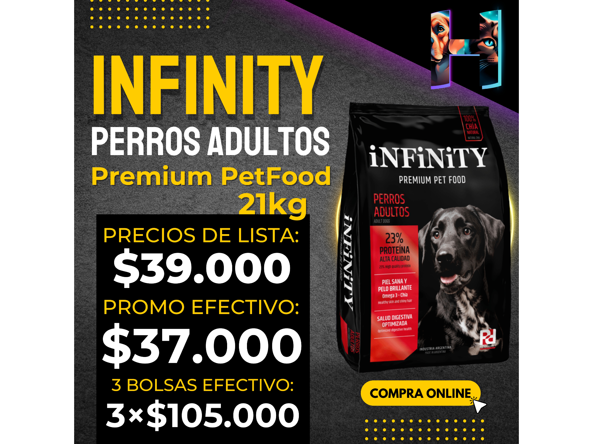 Infinity Perro Adulto x21kg Compartir Infinity Perro Adulto x21kg Presentaciones Seleccioná las opciones que quieras.Precio Promoción Exclusivo Abonando de Contado (Billetes). $39.000$37.000 5% OFF Precio de Lista Todos los Medios de Pagó. $39.000 Complementos para tu pedido Agregá items adicionales a tu pedido. EXTRA: PREMIO/ GOLOSINA Seleccioná las opciones que quieras.Pouch de Whiskas 85g$1.500PACK X 10 PALITOS EXTRUSADOS (PREMIO COMESTIBLE) SNACK PARA PERROS. $750$700 7% OFF PACK X 40 PALITOS EXTRUSADOS (PREMIO COMESTIBLE) SNACK PARA PERROS. $3.000$2.800 7% OFF Comederos Seleccioná las opciones que quieras.Comederos Clasico Mediano$2.000$1.300 35% OFF Comederos Clasico Grande$3.000$2.800 7% OFF Observaciones 0 / 150