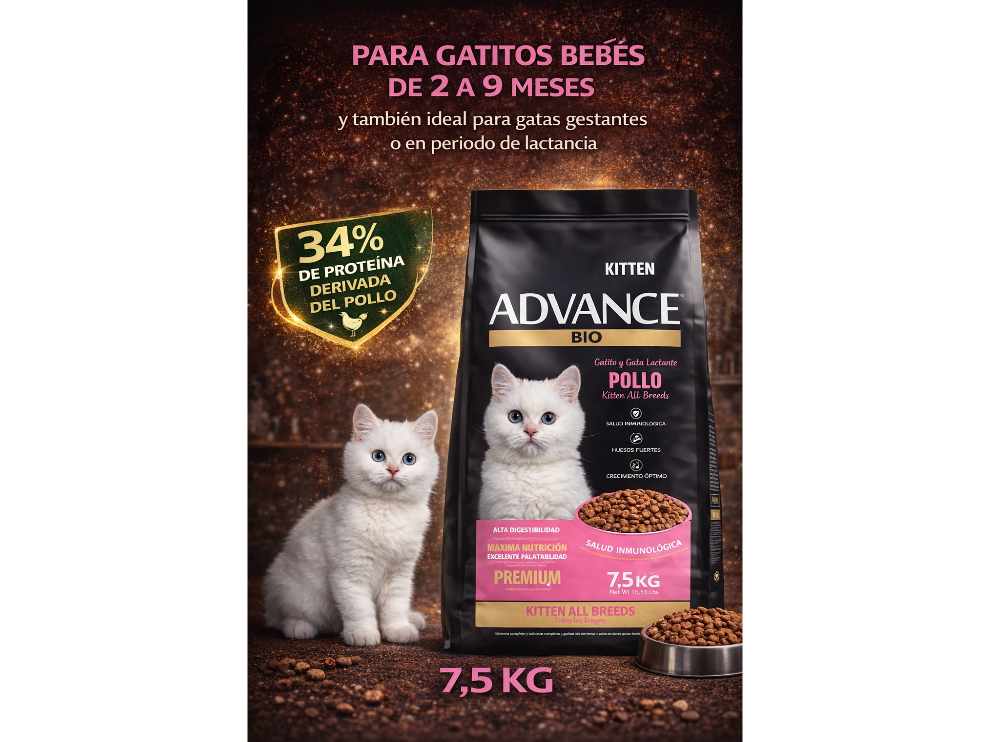 Advance Bio Gatitos y Madres Lactantes x 7,5Kg Compartir por WhatsApp Copiar enlace 🚨 Alimento Balanceado para Gatitos de 2 a 12 meses y Madres Gestantes o Lactantes. 🟢PRECIOS Y PROMOCIONES: Presentaciones Seleccioná las opciones que quieras.Precio de Lista Medios de Pagos: Debito, Credito, QR y Link. $54.000Promoción Especial Exclusivo Abonando de Contado o Transferencia. $54.000$48.600 10% OFF Fracción x 1kg Alimentos suelto. $7.500Promo Mayorísta Precio válido desde 3 unidades iguales, solo Pagos en Efectivo. $54.000$43.000 20% OFF Complementos para tu pedido Agregá items adicionales a tu pedido. Comederos Seleccioná las opciones que quieras.Comederos Clasico Mediano$2.700$1.900 30% OFF Comederos Clasico Grande$3.400$3.000 12% OFF EXTRA: PREMIO/ GOLOSINA Seleccioná las opciones que quieras.Pouch de Whiskas 85g$1.600PACK X 10 PALITOS EXTRUSADOS (PREMIO COMESTIBLE) SNACK PARA PERROS. $750$700 7% OFF PACK X 40 PALITOS EXTRUSADOS (PREMIO COMESTIBLE) SNACK PARA PERROS. $3.000$2.800 7% OFF Observaciones 0 / 150 Encontrá productos relacionados RECOMENDADOS (55)