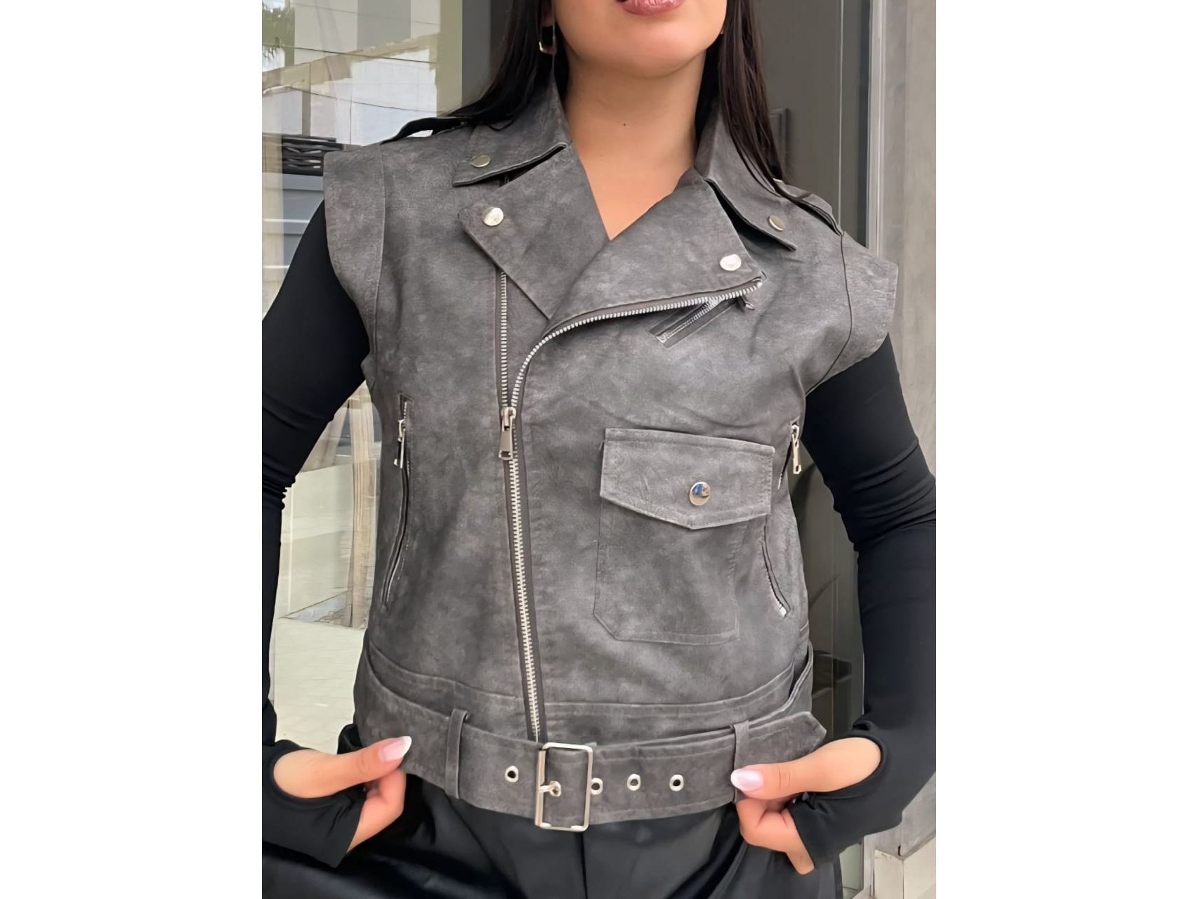 FOGGIA Compartir Chaleco símil cuero con cinto, modelo jaspeada Bolsillos con cierres Colores: Negro desgastado, beige$39.000 Observaciones 0 / 150