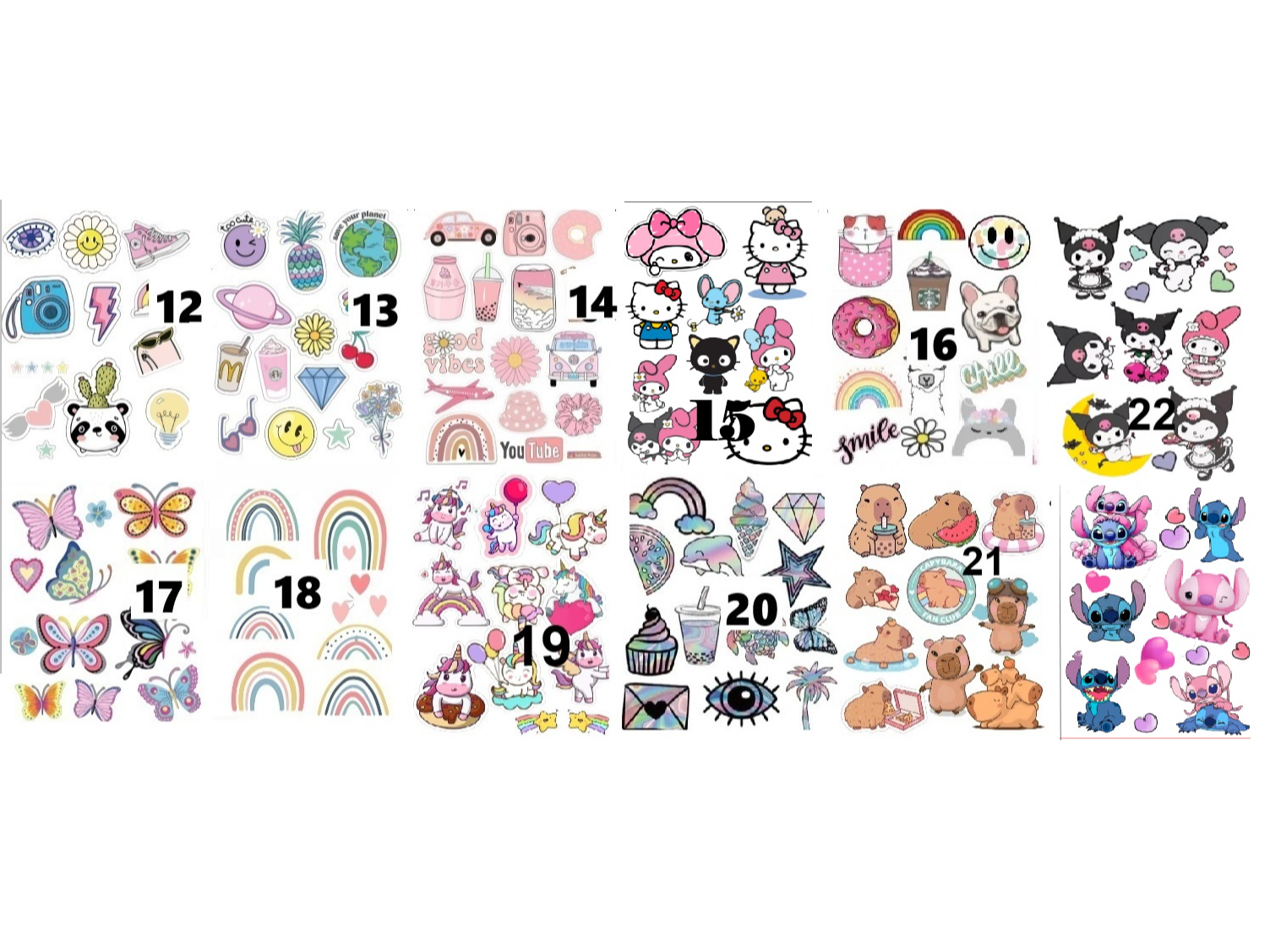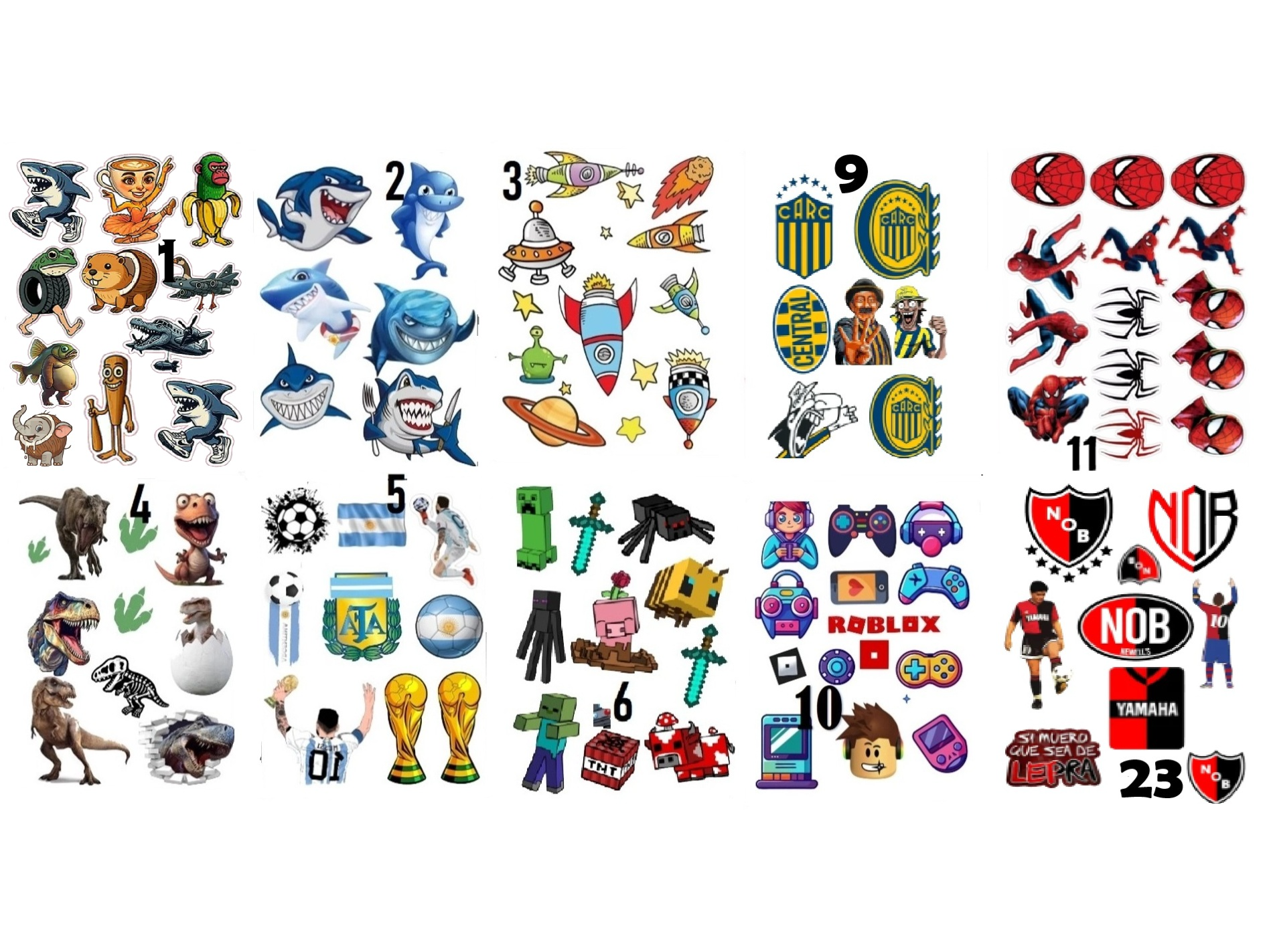 Tatoo temporales, varios dibujos por plancha. Elegir opciones disponibles. Ideales para niños y niñas. MEDIDA plancha : 10cm. x 7 cm. Aprox. La cantidad varia según cada modelo. Ver modelos en las fotos y seleccionar el elegido.