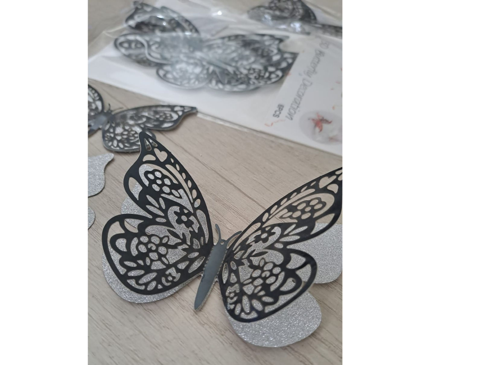 ADORNO MARIPOSA DOBLE ESTAMPADO PACK 6 UNIDADES BASE PLATA GIBRERADA Y SEGUNDA CAPA NEGRO CALADO Cantidad por paquete: 6 unidades MEDIDA : MEDIDAS APROX Grandes: ancho 12 cm x alto 8 cm. Medianas: ancho 10 cm x alto 6 cm. Medianas: ancho 8 cm x alto 5 cm. Material: Acetato Uso: Confección, Decoración, Souvenirs, Centros de mesa, Cumpleaños, Casamientos, etc.