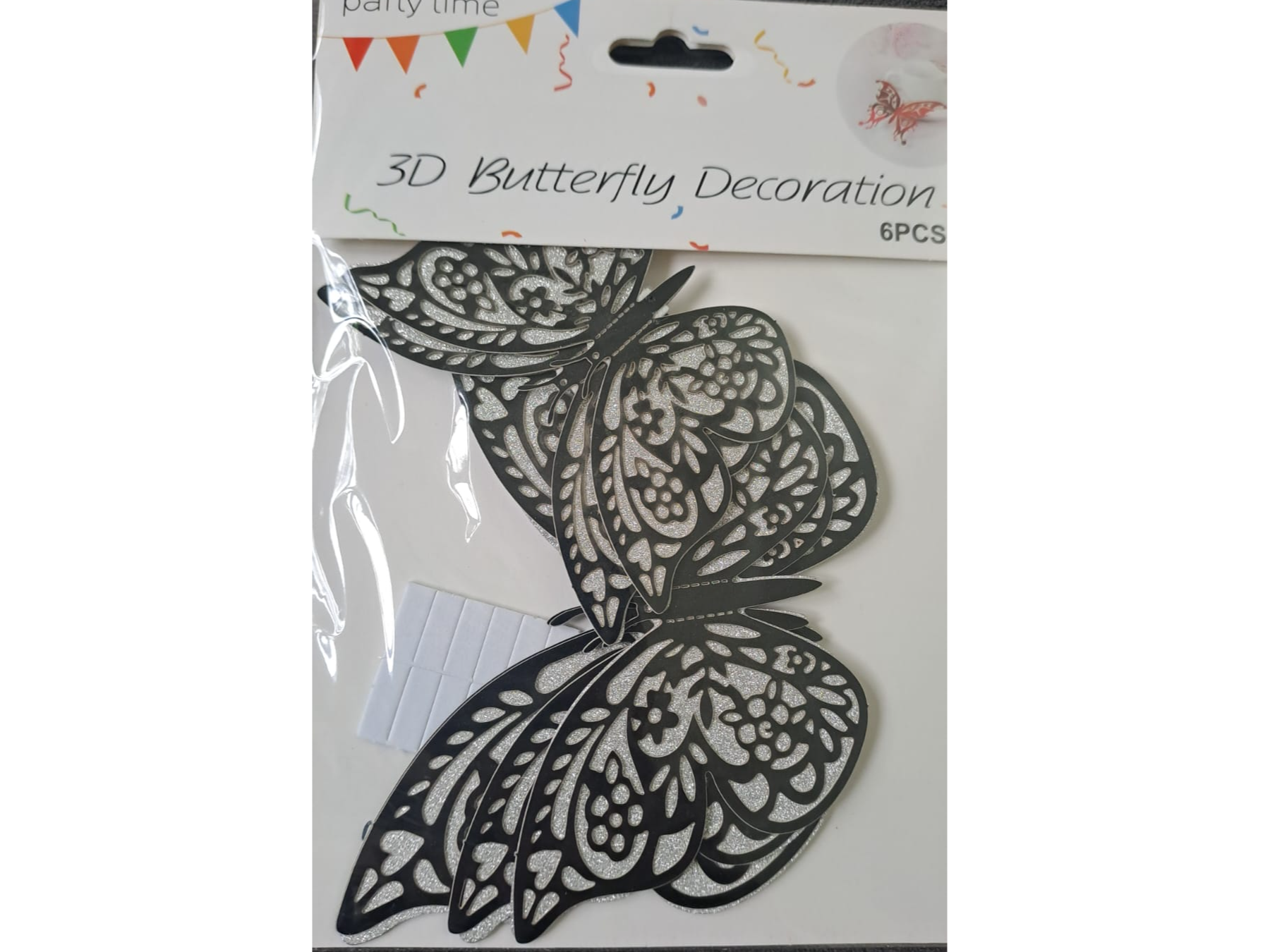 ADORNO MARIPOSA PLATA Y NEGRO DOBLES 3D X 6 UNIDADES