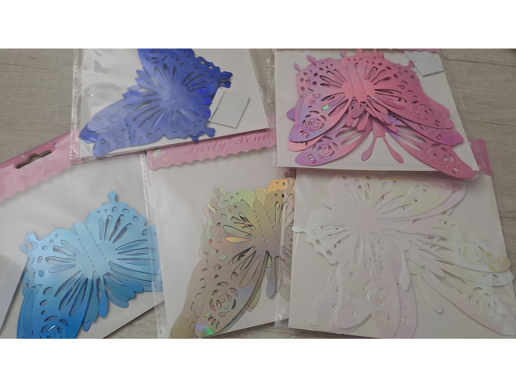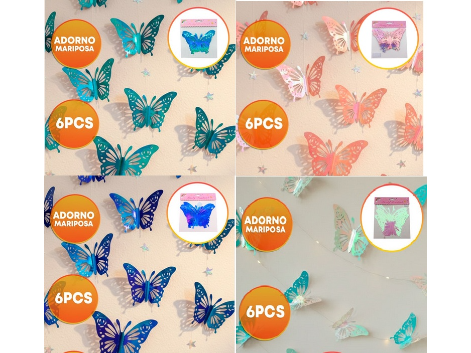 ADORNO MARIPOSA TORNASOLADA PACK 6 UNIDADES MISMA MEDIDA Cantidad por paquete: 6 unidades MEDIDA : MEDIDAS APROX Grandes: ancho 10cm x alto 7cm. Material: Acetato Uso: Confección, Decoración, Souvenirs, Centros de mesa, Cumpleaños, Casamientos, etc.