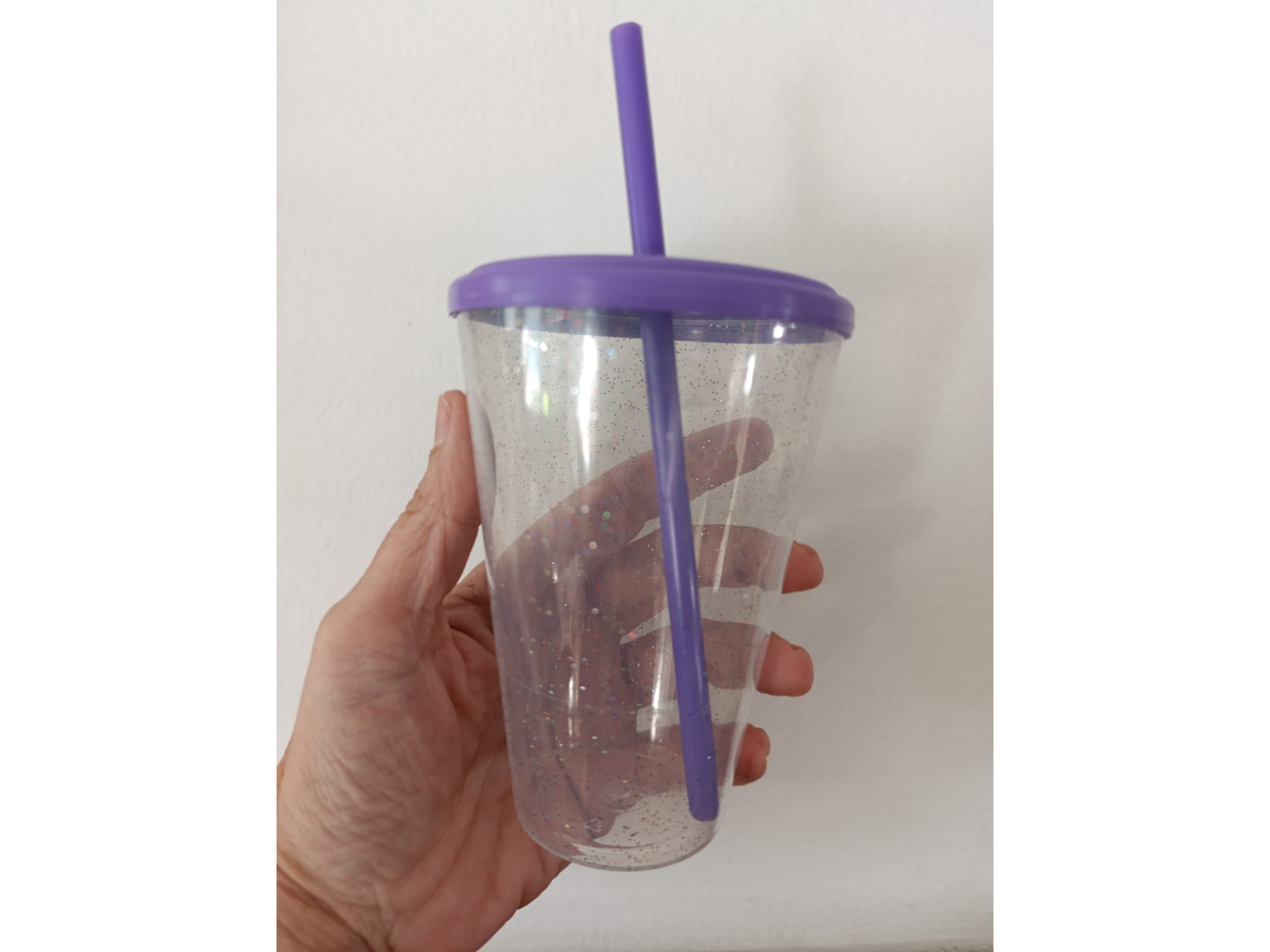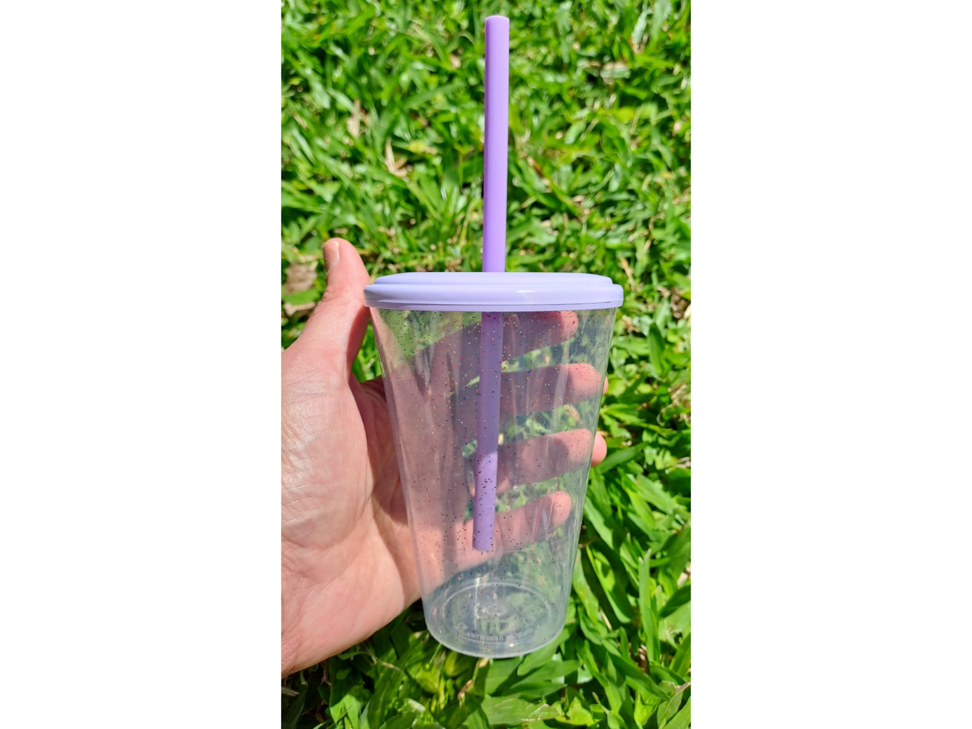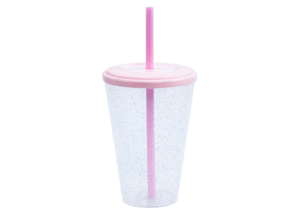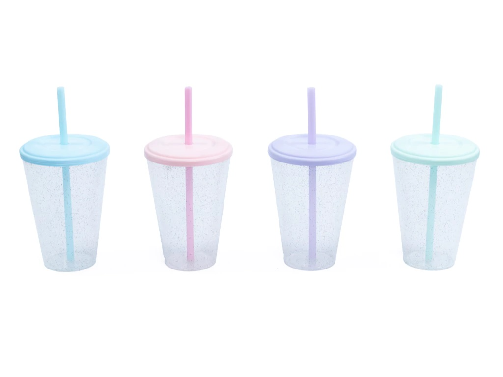 Vaso CON GLITTERS de plástico conico rígido con tapa de cierre hermético y sorbete rígido. Con capacidad de 420 cc. Apto microondas. EXCELENTE CALIDAD -