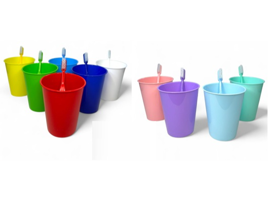 Vaso plástico eco sin tapa, con capacidad de 225 cc. Medida del vaso: 9.5 cm de alto x 7cm. de diámetro y base de 5 cm. de diámetro. El cepillo de dientes cuenta con envoltorio individual. Medida del mango 14,3 cm. de largo X 1,3 cm. y cabezal: 2,5 cm. El stock disponible de colores es el que aparece en el catálogo. DEBE COINCIDIR EL NUMERO DE COMBOS MARCADOS CON EL TOTAL DE COLORES DE VASOS Y CEPILLOS ELEGIDOS.