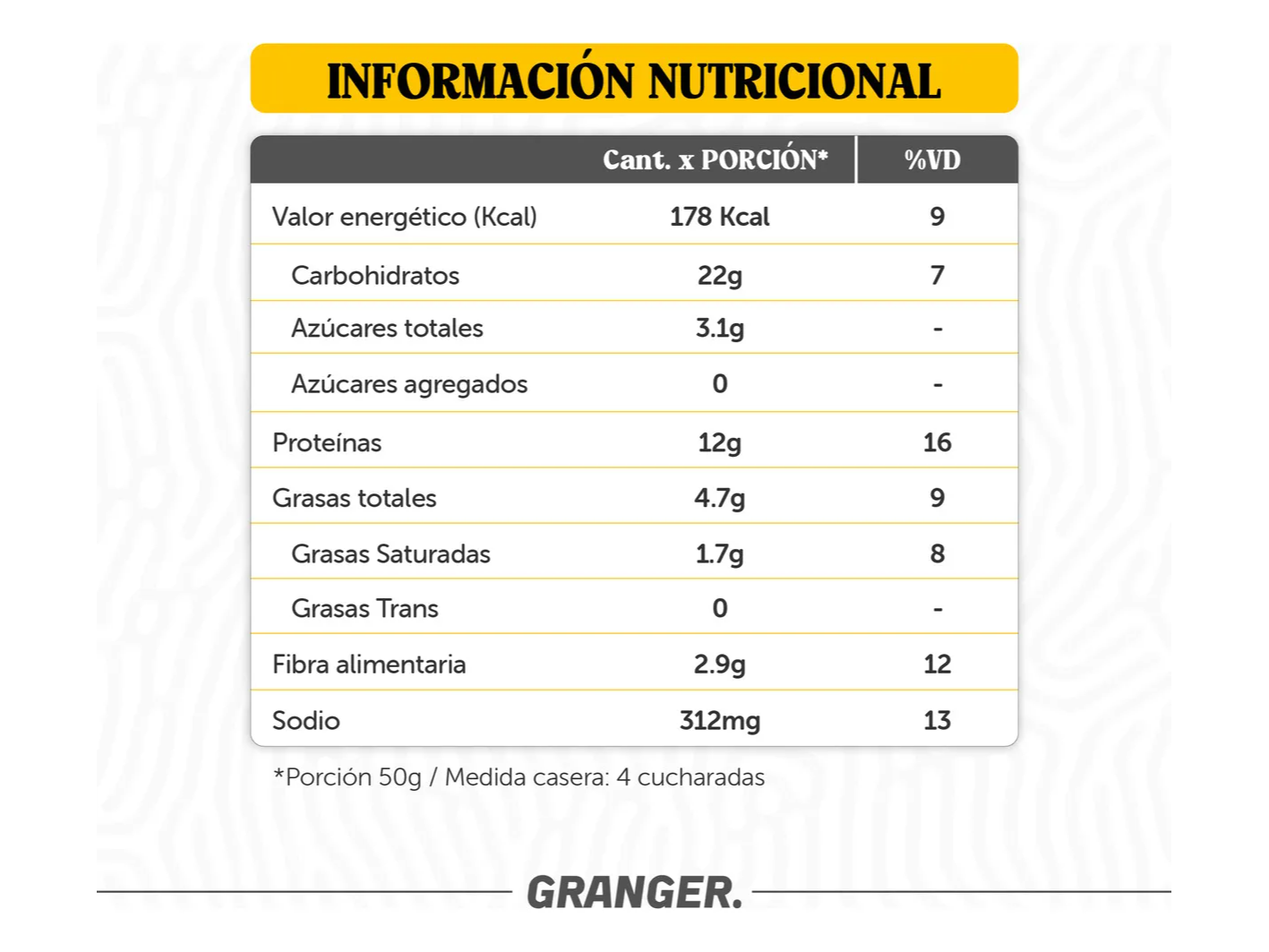 INGREDIENTES: Avena, concentrado de suero de leche, quinoa, queso en polvo, leche descremada, huevo, polvo de hornear; ARO: Queso