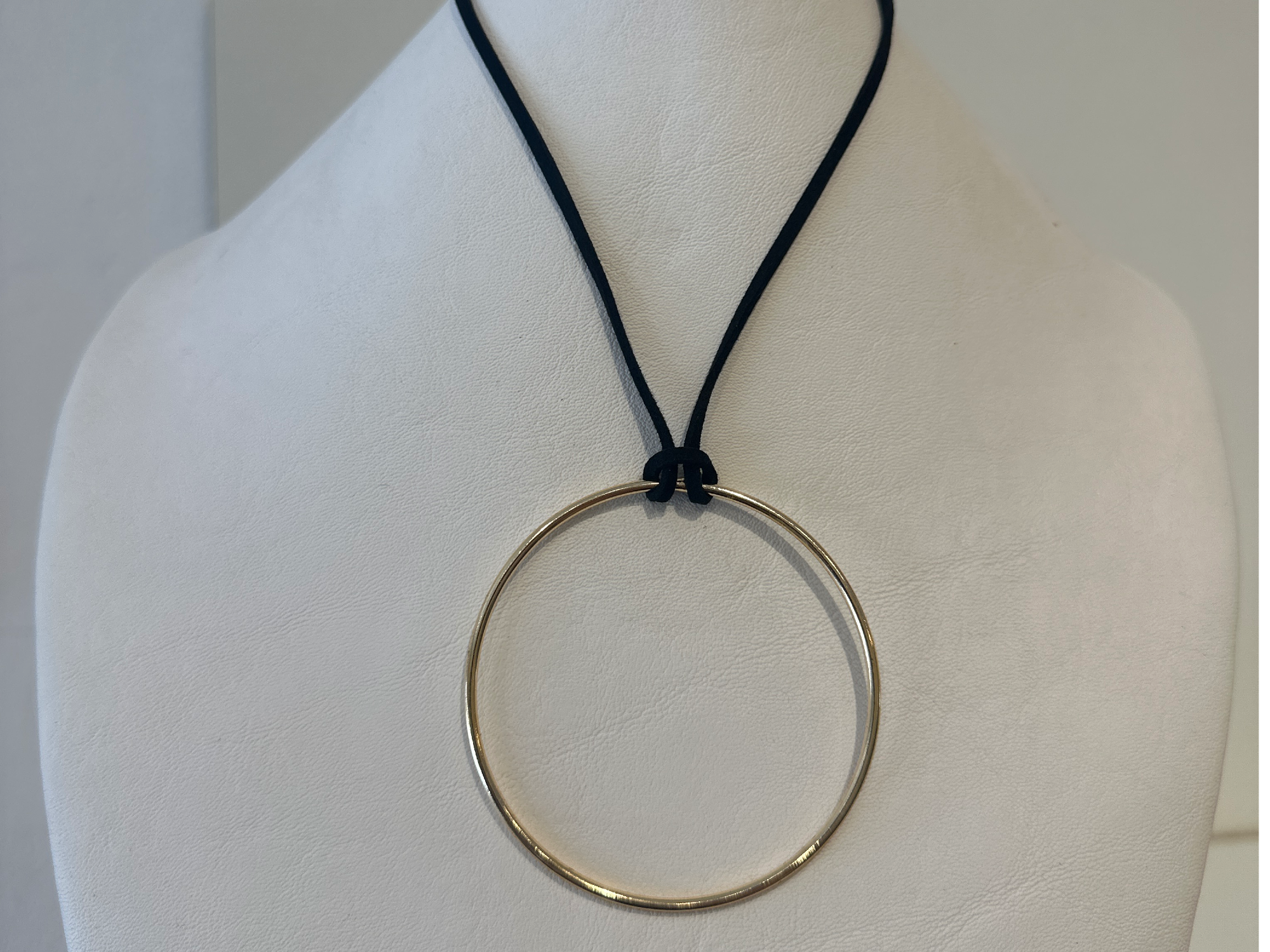 Choker circulo dorado Compartir 2 unidades en stock Dije círculo grande dorado, color de gamuza negro.$3.500 Observaciones 0 / 150