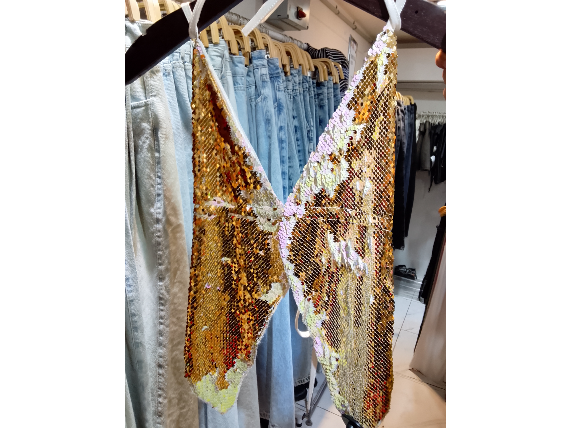 Top Britney Compartir 8 unidades en stock Lentejuelas doble cara Espalda descubierta T.U Colores disponibles: •Dorado-blanco perlado •rosa perlado-blanco$18.999 Observaciones 0 / 150