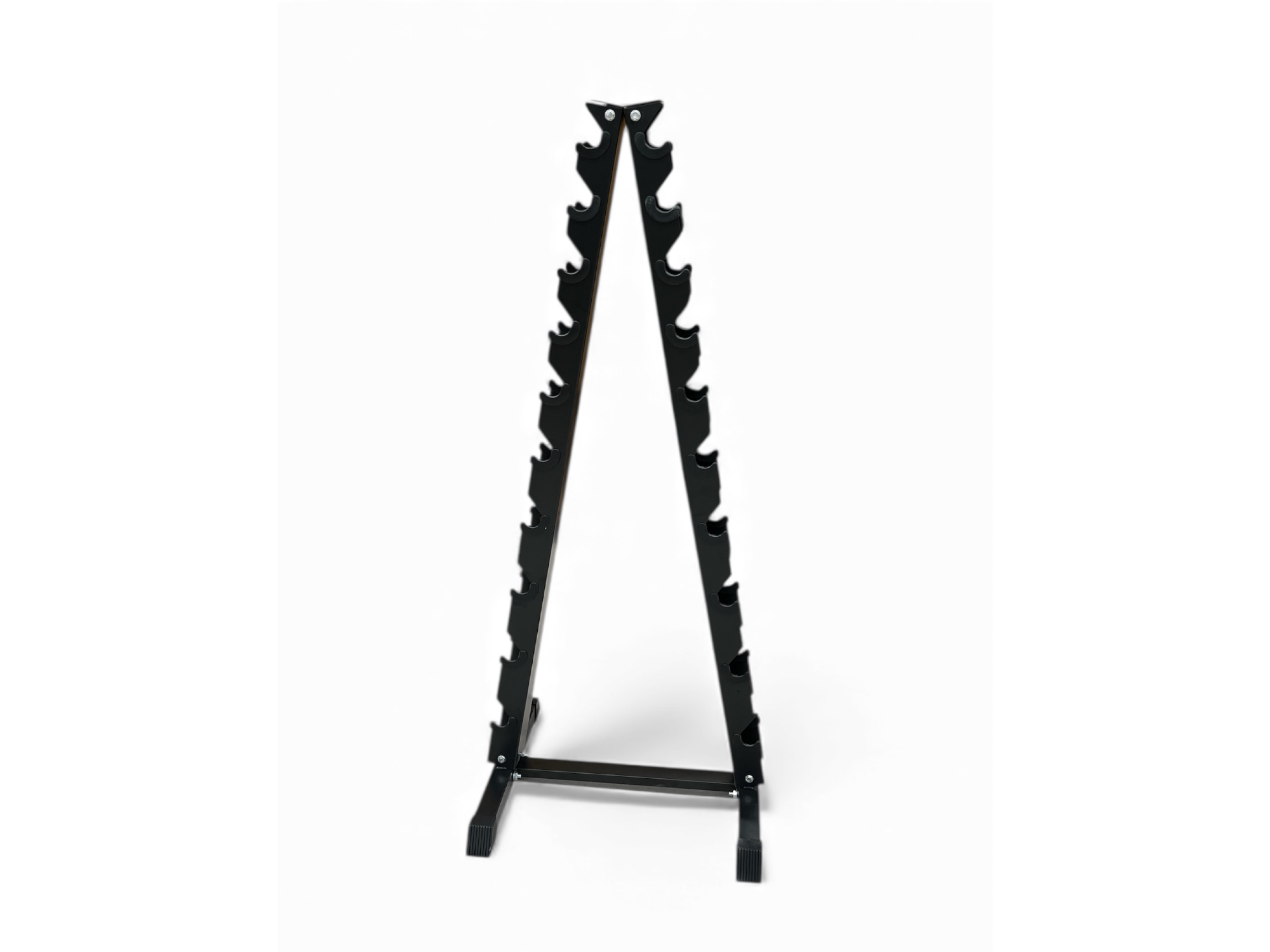 - Optimiza tu espacio y mantén tu área de entrenamiento organizada con nuestro mancuernero vertical en forma de A, diseñado para 10 pares de mancuernas hexagonales.