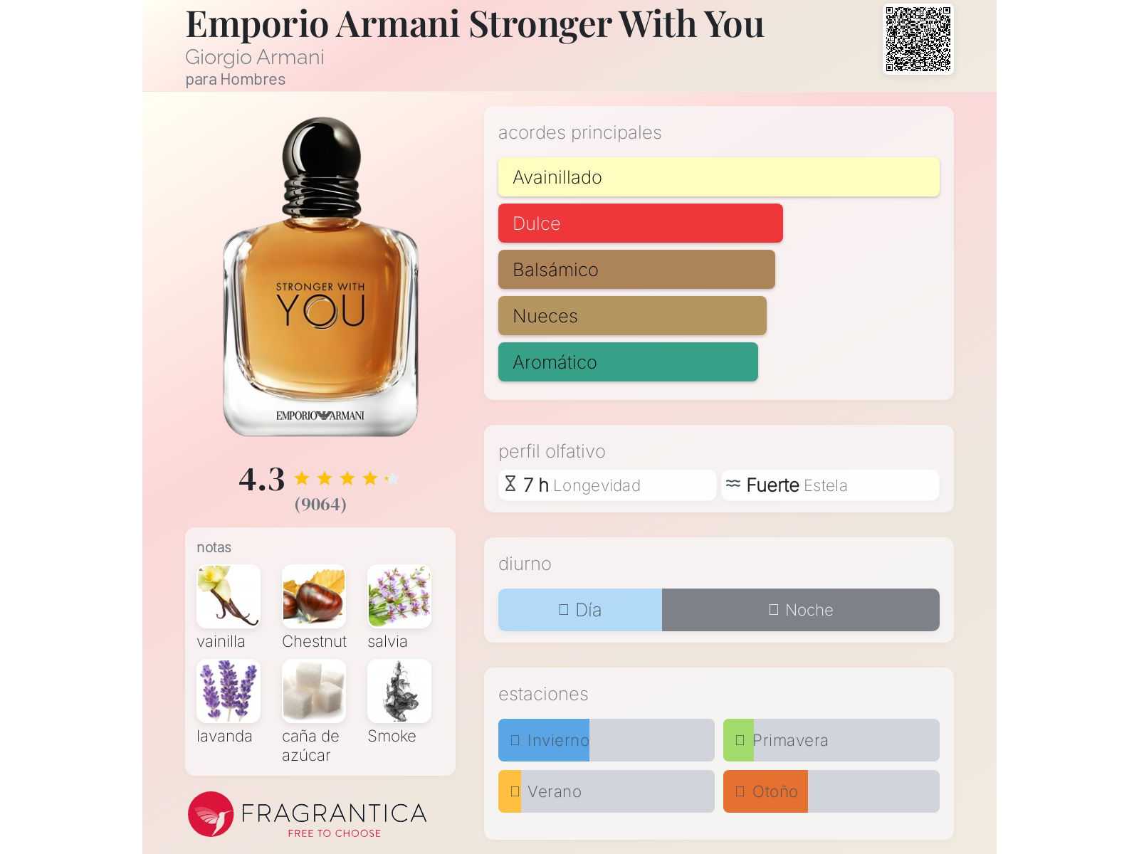 Emporio Armani Stronger With You de Giorgio Armani es una fragancia de la familia olfativa Aromática Fougère para Hombres. Emporio Armani Stronger With You se lanzó en 2017. La Nariz detrás de esta fragrancia es Cecile Matton. Las Notas de Salida son castaña y azúcar; las Notas de Corazón son salvia y lavanda; las Notas de Fondo son vainilla y Humo.
