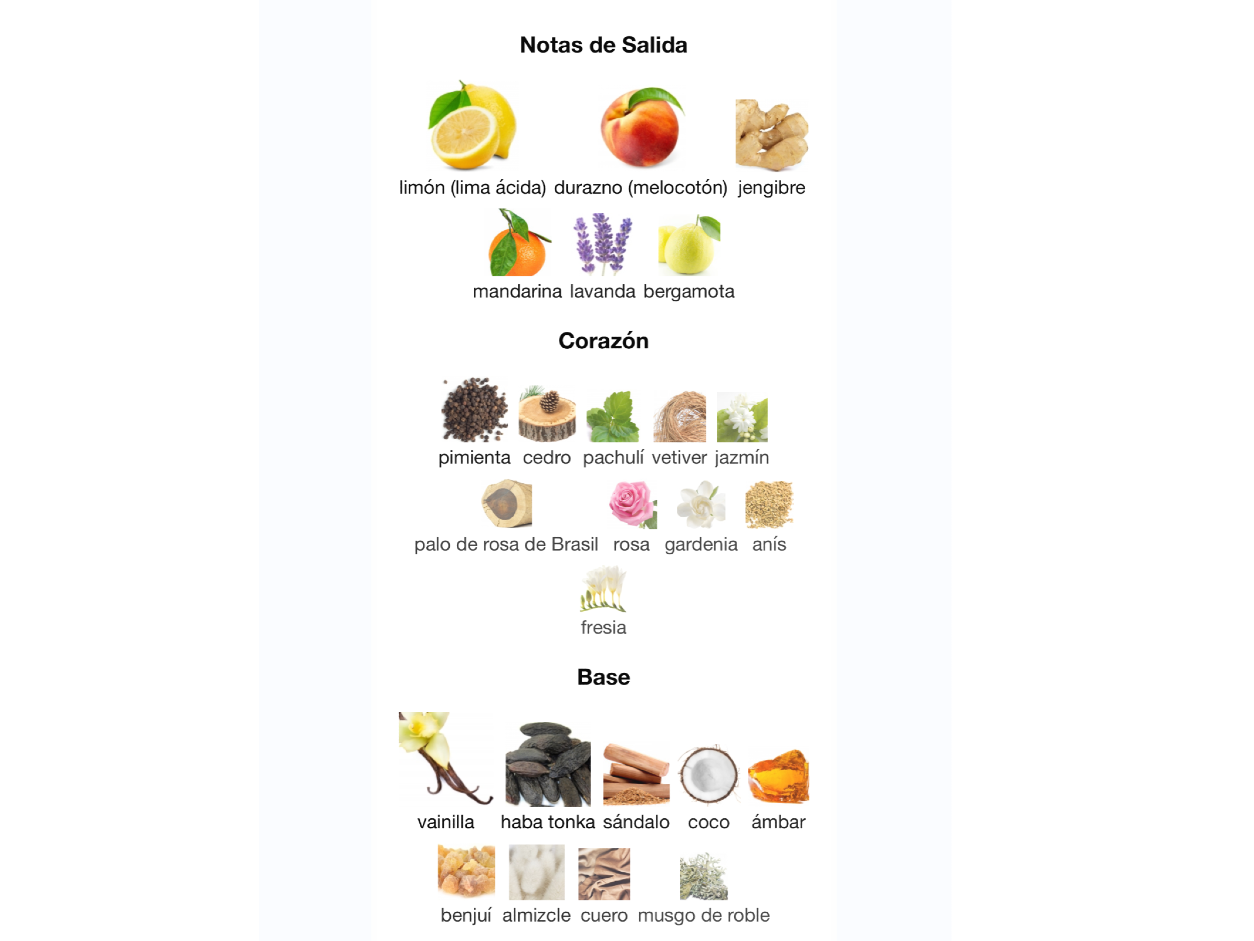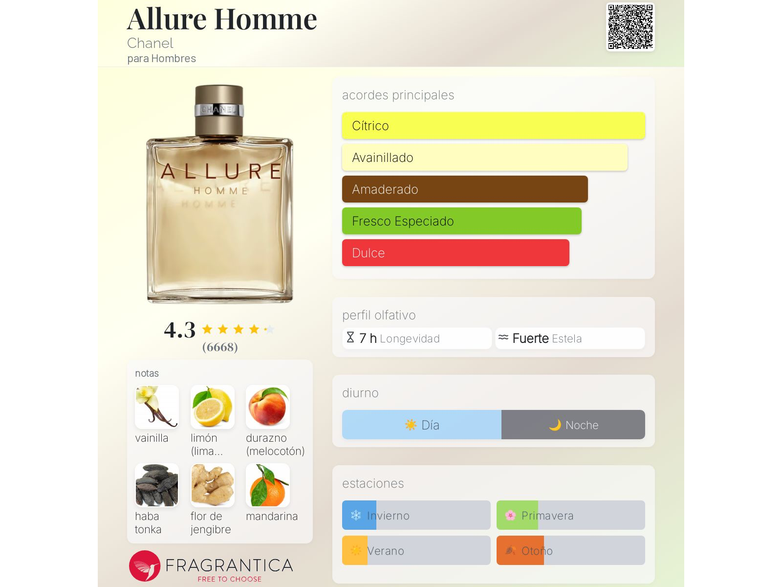 Allure Homme de Chanel es una fragancia de la familia olfativa Oriental Amaderada para Hombres. Allure Homme se lanzó en 1999. La Nariz detrás de esta fragrancia es Jacques Polge. Las Notas de Salida son limón (lima ácida), durazno (melocotón), jengibre, mandarina, lavanda y bergamota; las Notas de Corazón son pimienta, cedro, pachulí, vetiver, jazmín, palo de rosa de Brasil, rosa, gardenia, anís y fresia; las Notas de Fondo son vainilla, haba tonka, sándalo, coco, ámbar, benjuí, almizcle, cuero y musgo de roble.