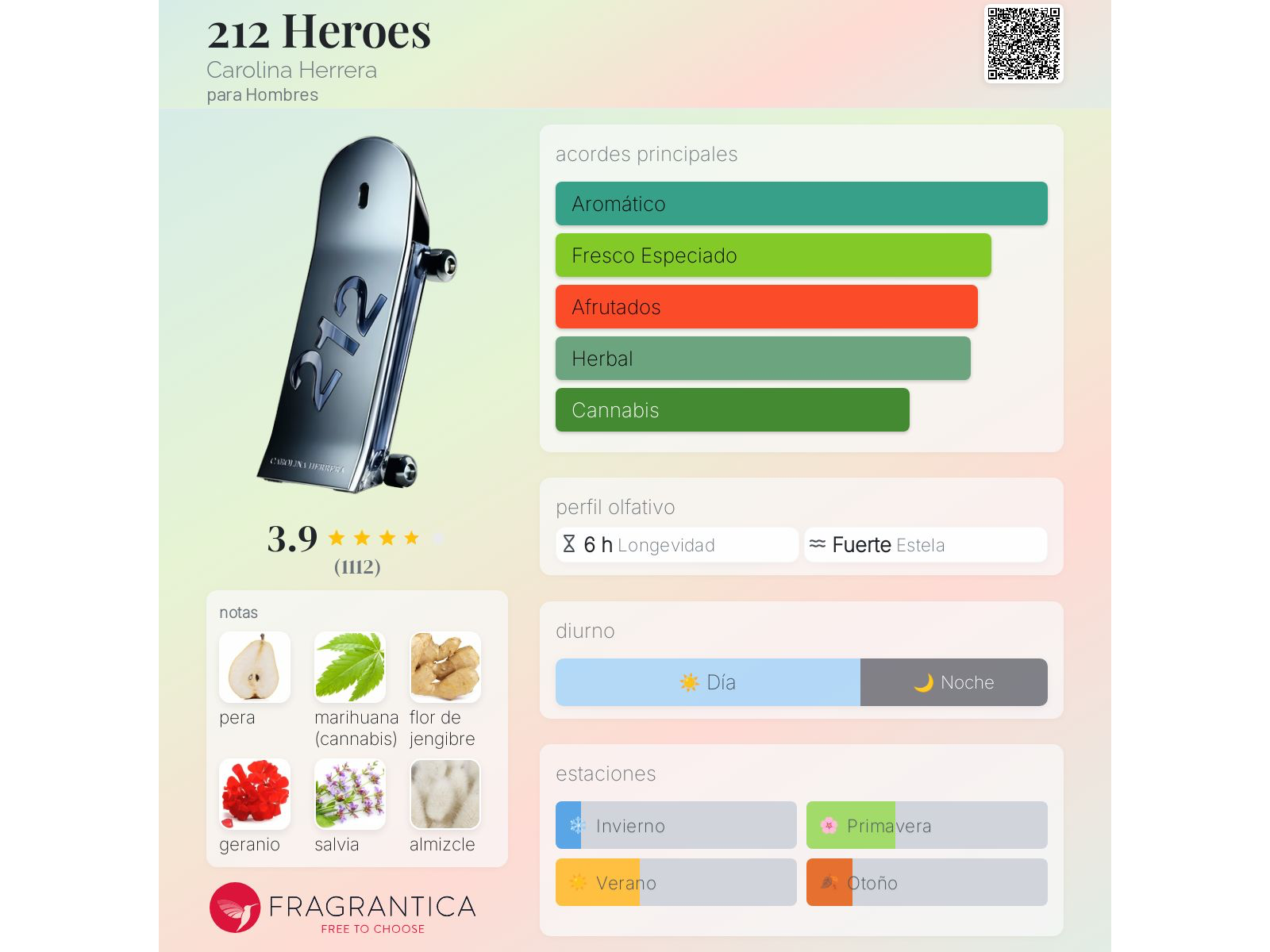 212 Heroes de Carolina Herrera es una fragancia de la familia olfativa Aromática Frutal para Hombres. 212 Heroes se lanzó en 2021. 212 Heroes fue creada por Domitille Michalon Bertier, Juliette Karagueuzoglou y Carlos Benaïm. Las Notas de Salida son pera, marihuana (cannabis) y jengibre; las Notas de Corazón son geranio y salvia; las Notas de Fondo son almizcle y cuero.