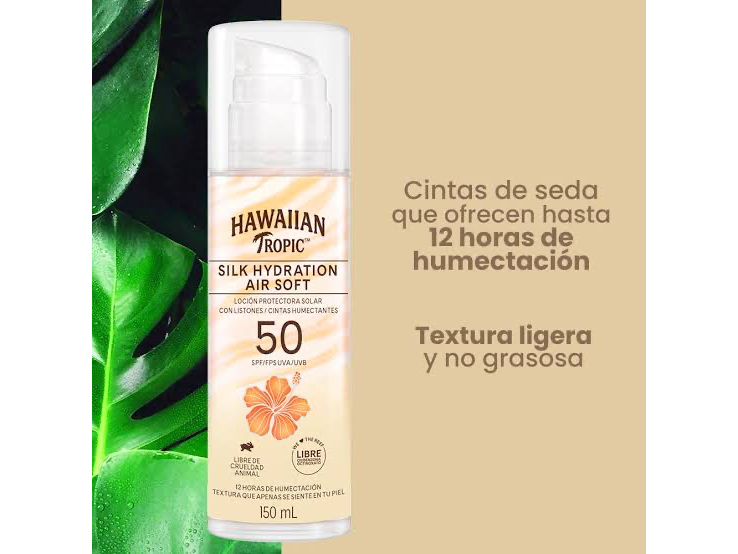 Hawaiian Tropic Silk Hydration Air Soft – Protector Solar FPS 50 (150 ml) Compartir por WhatsApp Copiar enlace Protector solar corporal de alta protección FPS 50 con textura ultra liviana y sedosa. Brinda protección UVA/UVB mientras hidrata la piel hasta por 12 horas gracias a sus cintas humectantes. Se absorbe rápido, no deja sensación grasosa y deja la piel suave, fresca y confortable.$890 Observaciones 0 / 150