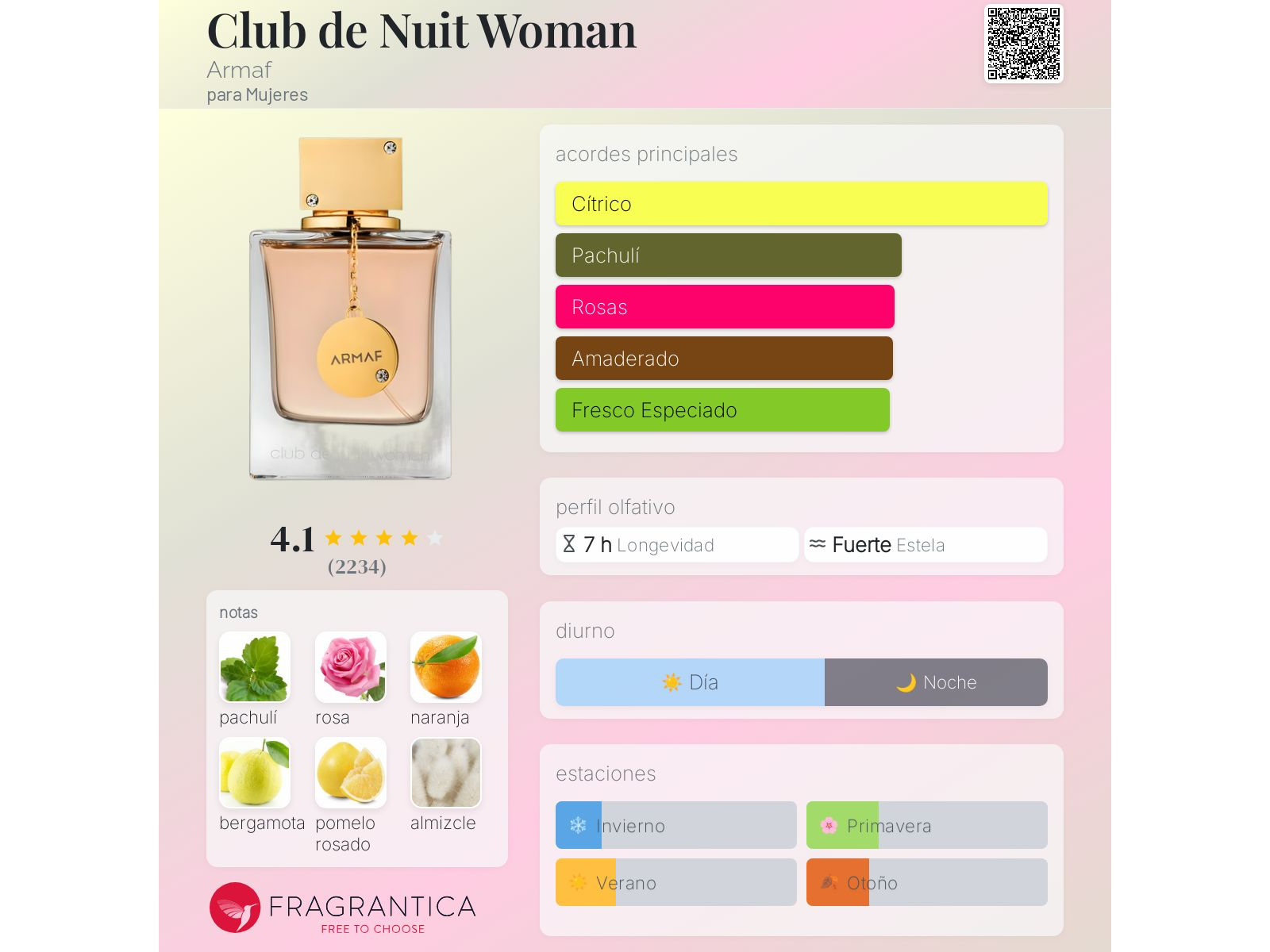 Club de Nuit Woman de Armaf es una fragancia de la familia olfativa Floral Frutal para Mujeres. Las Notas de Salida son naranja, bergamota, toronja (pomelo) y durazno (melocotón); las Notas de Corazón son rosa, jazmín, lichi y geranio; las Notas de Fondo son pachulí, almizcle, vainilla y vetiver.