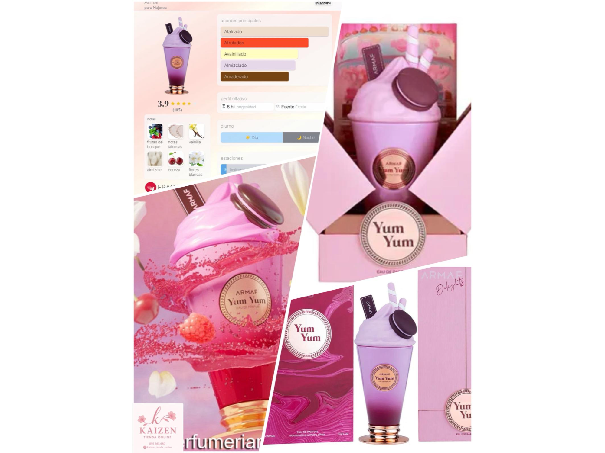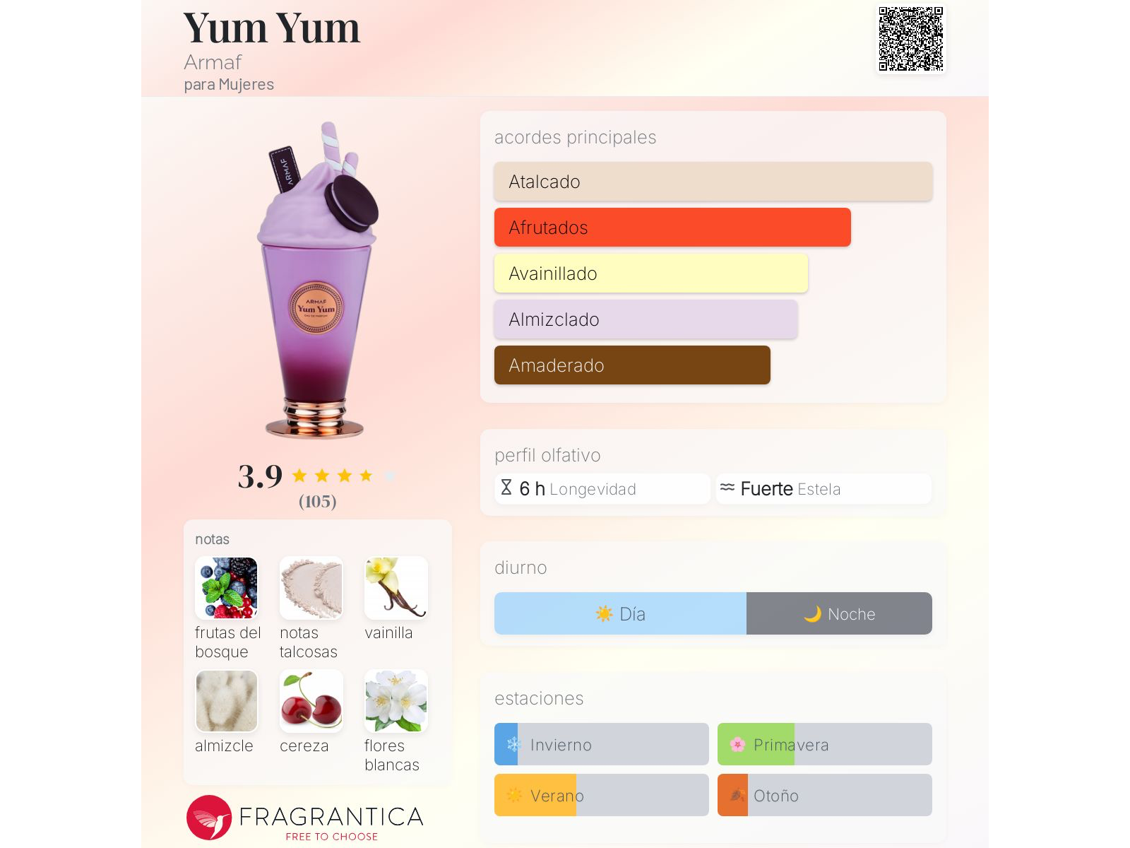 Yum Yum de Armaf es una fragancia de la familia olfativa Floral Frutal para Mujeres. Esta fragrancia es nueva. Yum Yum se lanzó en 2024. Las Notas de Salida son bayas silvestres, cereza, naranja y bergamota; las Notas de Corazón son vainilla, flores blancas y rosa; las Notas de Fondo son notas atalcadas, almizcle y ámbar.