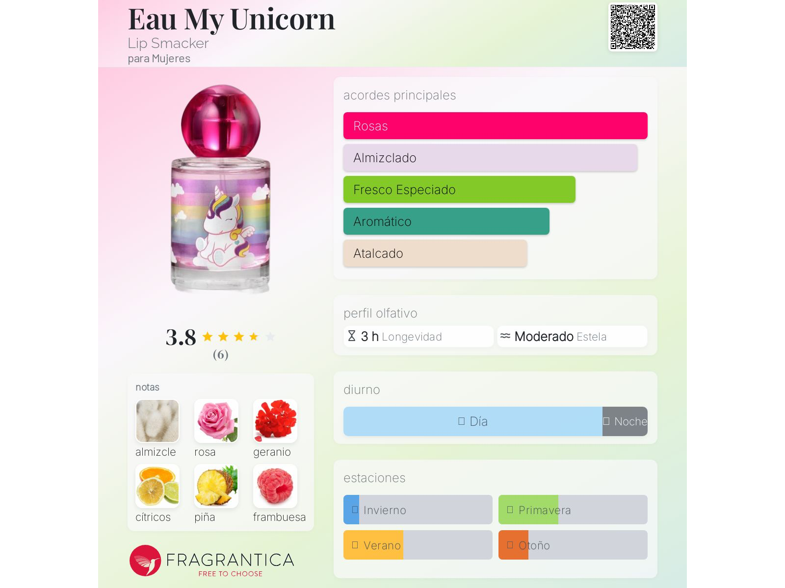 Eau My Unicorn de Lip Smacker es una fragancia de la familia olfativa para Mujeres. Eau My Unicorn se lanzó en 2021. Las Notas de Salida son cítricos, piña y frambuesa; la Nota de Corazón es rosa; las Notas de Fondo son almizcle, geranio y violeta.