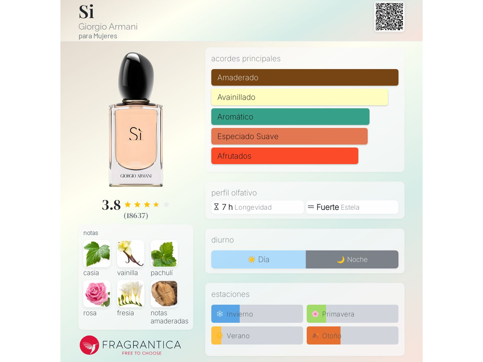 Si de Giorgio Armani es una fragancia de la familia olfativa Chipre Frutal para Mujeres. Si se lanzó en 2013. La Nariz detrás de esta fragrancia es Christine Nagel. La Nota de Salida es casis (grosellero negro); las Notas de Corazón son rosa de mayo y fresia; las Notas de Fondo son vainilla, pachulí, notas amaderadas y ambroxan.