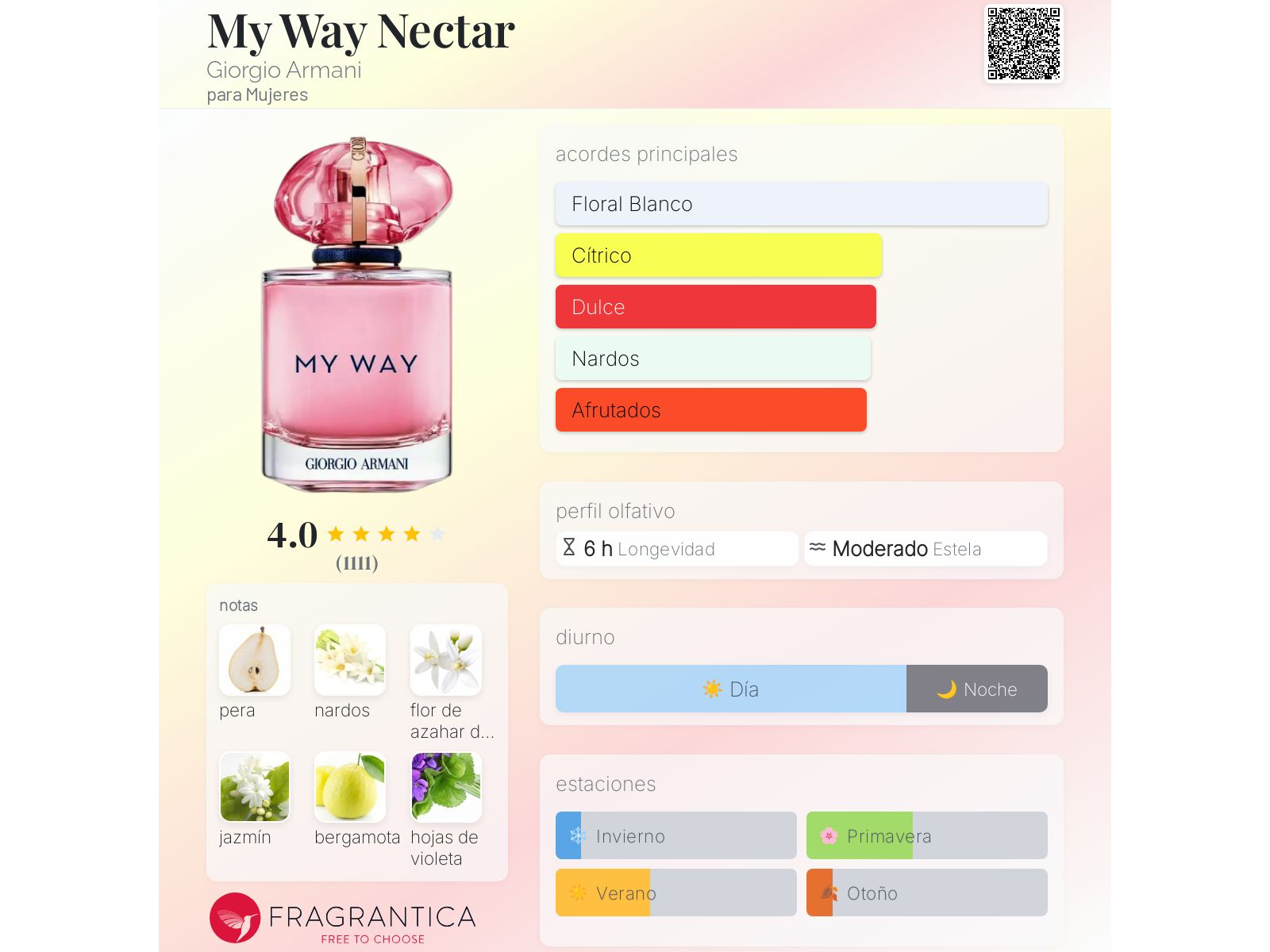 My Way Nectar de Giorgio Armani es una fragancia de la familia olfativa Floral Frutal para Mujeres. Esta fragrancia es nueva. My Way Nectar se lanzó en 2024. Las Notas de Salida son pera, flor de azahar del naranjo y bergamota; las Notas de Corazón son nardos, jazmín y hojas de violeta; las Notas de Fondo son almizcle blanco, vainilla Bourbon y cedro.