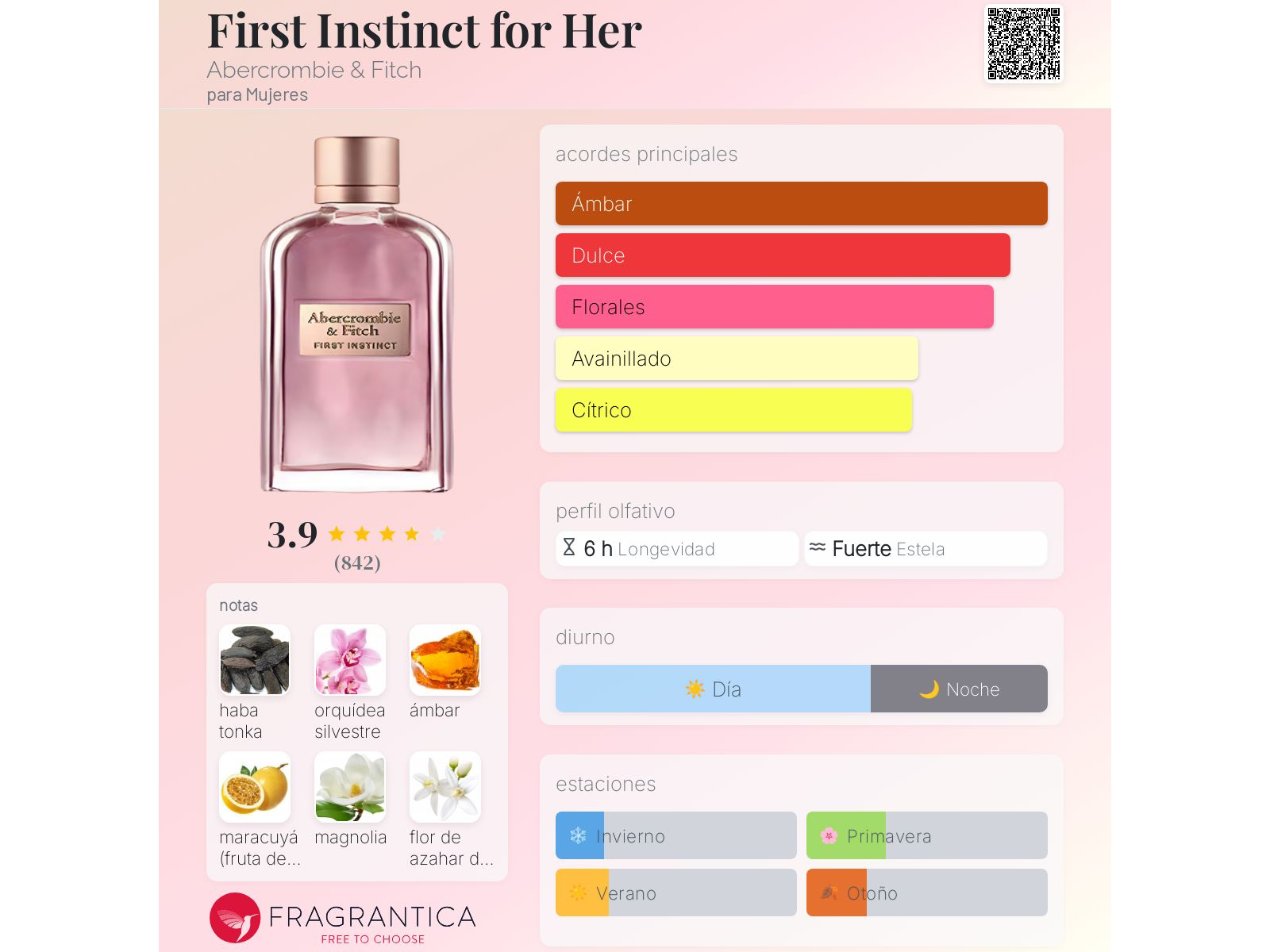 First Instinct for Her de Abercrombie & Fitch es una fragancia de la familia olfativa Oriental Floral para Mujeres. First Instinct for Her se lanzó en 2017. Las Notas de Salida son maracuyá (fruta de la pasión), magnolia y toronja (pomelo); las Notas de Corazón son orquídea mariposa y flor de azahar del naranjo; las Notas de Fondo son haba tonka y ámbar. SIN TAPA