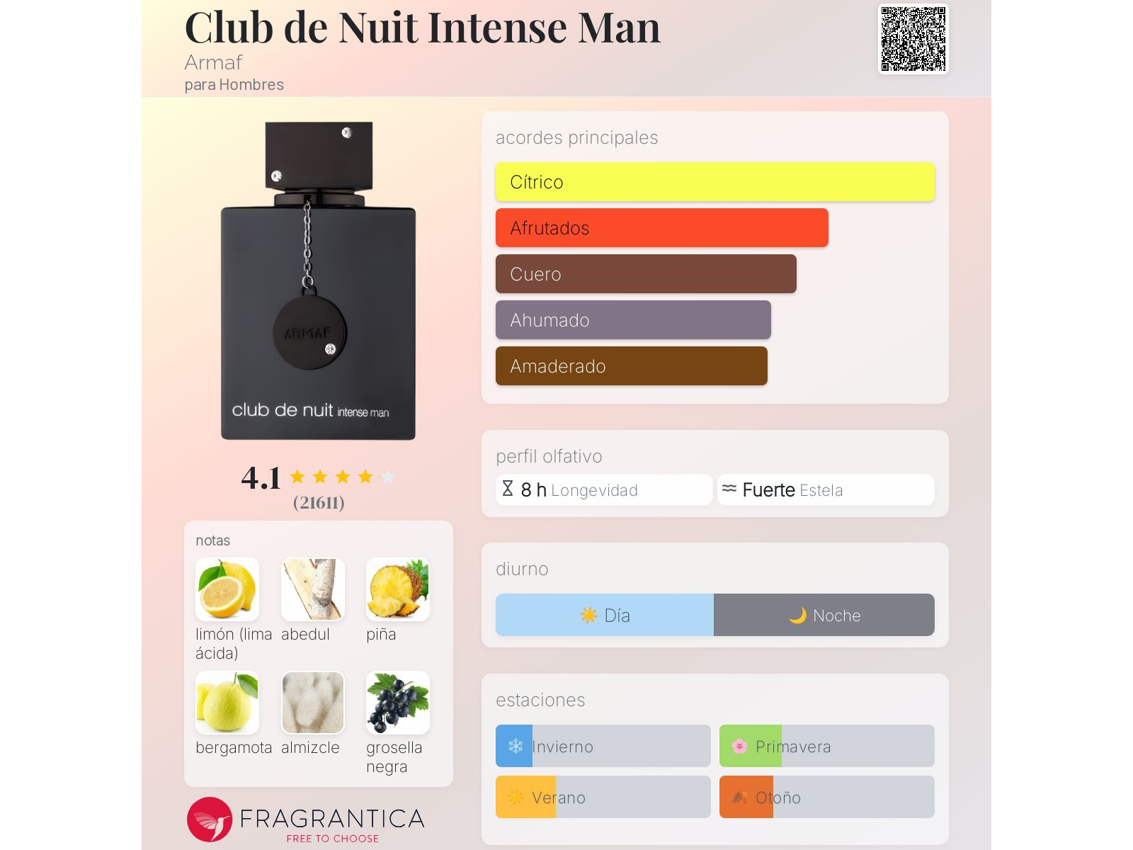 Club de Nuit Intense Man de Armaf es una fragancia de la familia olfativa Amaderada Especiada para Hombres. Club de Nuit Intense Man se lanzó en 2015. Las Notas de Salida son limón (lima ácida), piña, bergamota, grosellas negras y manzana; las Notas de Corazón son abedul, jazmín y rosa; las Notas de Fondo son almizcle, ámbar gris, pachulí y vainilla.