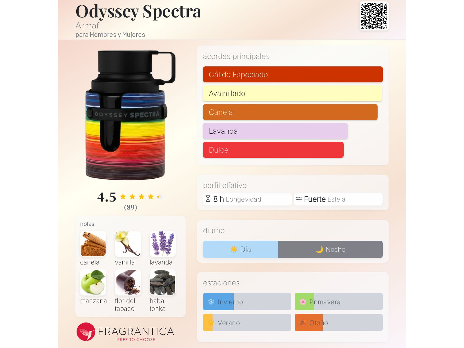 Odyssey Spectra de Armaf es una fragancia de la familia olfativa Oriental Especiada para Hombres y Mujeres. Esta fragrancia es nueva. Odyssey Spectra se lanzó en 2024. Las Notas de Salida son canela, manzana y bergamota; las Notas de Corazón son canela, lavanda, lirio de los valles (muguete) y flor de azahar del naranjo; las Notas de Fondo son vainilla, tabaco, haba tonka, pachulí y ámbar.