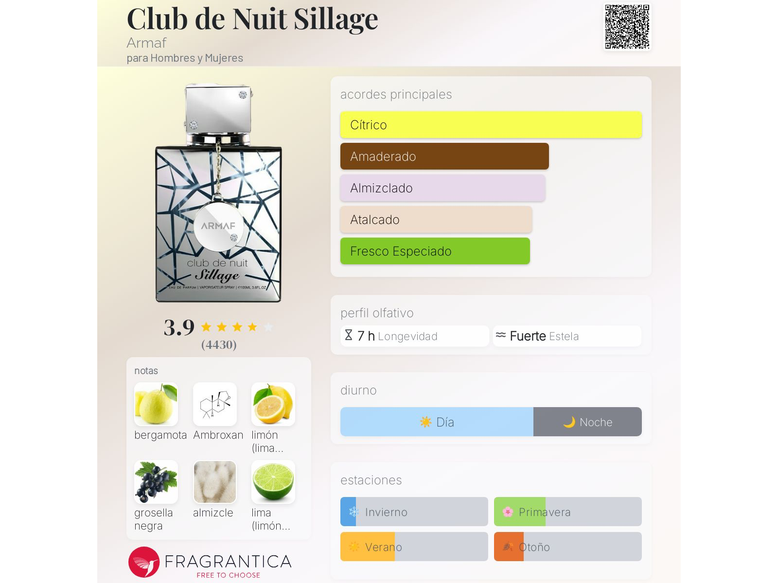 Club de Nuit Sillage de Armaf es una fragancia de la familia olfativa Almizcle Floral Amaderado para Hombres y Mujeres. Club de Nuit Sillage se lanzó en 2020. Las Notas de Salida son bergamota, limón (lima ácida), grosellas negras, lima (limón verde), hojas de violeta y jengibre; las Notas de Corazón son rosa, iris y jazmín; las Notas de Fondo son ambroxan, almizcle, sándalo y cedro.