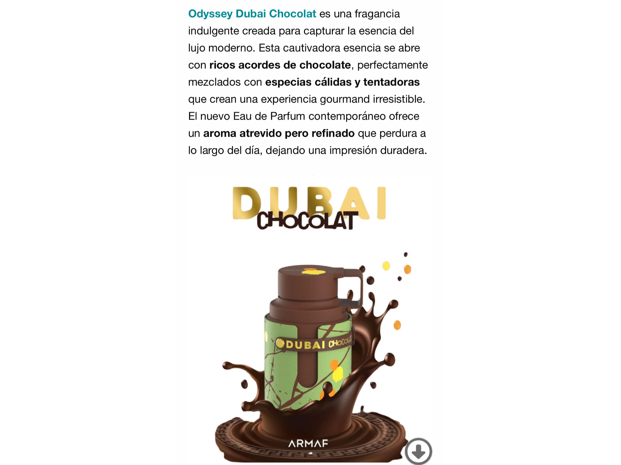 Odyssey Dubai Chocolat de Armaf es una fragancia de la familia olfativa Oriental Vainilla para Hombres y Mujeres. Esta fragrancia es nueva. Odyssey Dubai Chocolat se lanzó en 2025. Las Notas de Salida son café, pistacho (pistache), Knafeh, praliné y avellana; las Notas de Corazón son chocolate, vainilla y cardamomo; las Notas de Fondo son caramelo, Amberwood y haba tonka.