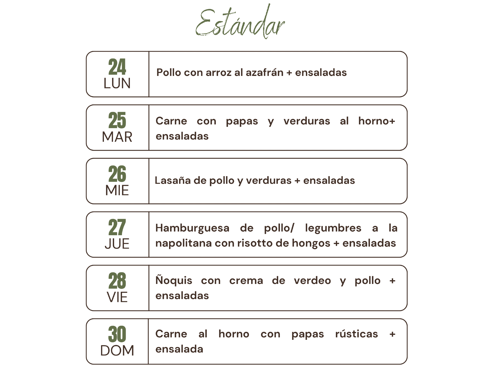 Vianda EstándarDesliza la siguiente imagen para conocer el menú de esta semana👉 Presentaciones Seleccioná una opción.tamaño pequeño (300g) Menú completo en hidratos, proteinas y con ensalada incluida. en caso de haber algun alimento que no le guste o no tolere especificar, y lo tendremos en cuenta. $8.000tamaño mediano (500g) Menú completo en hidratos, proteinas y con ensalada incluida. en caso de haber algun alimento que no le guste o no tolere especificar, y lo tendremos en cuenta. $9.000tamaño grande (800g) Menú completo en hidratos, proteinas y con ensalada incluida. en caso de haber algun alimento que no le guste o no tolere especificar, y lo tendremos en cuenta. $11.000 Complementos para tu pedido Agregá items adicionales a tu pedido. Vianda hiper proteica Seleccioná las opciones que quieras.Opción hiper proteíca (omnívoro) 60 gr de proteina aprox (150 extras de carne o pollo extras del menú del día) + un huevo duro $1.500 Observaciones 0 / 150