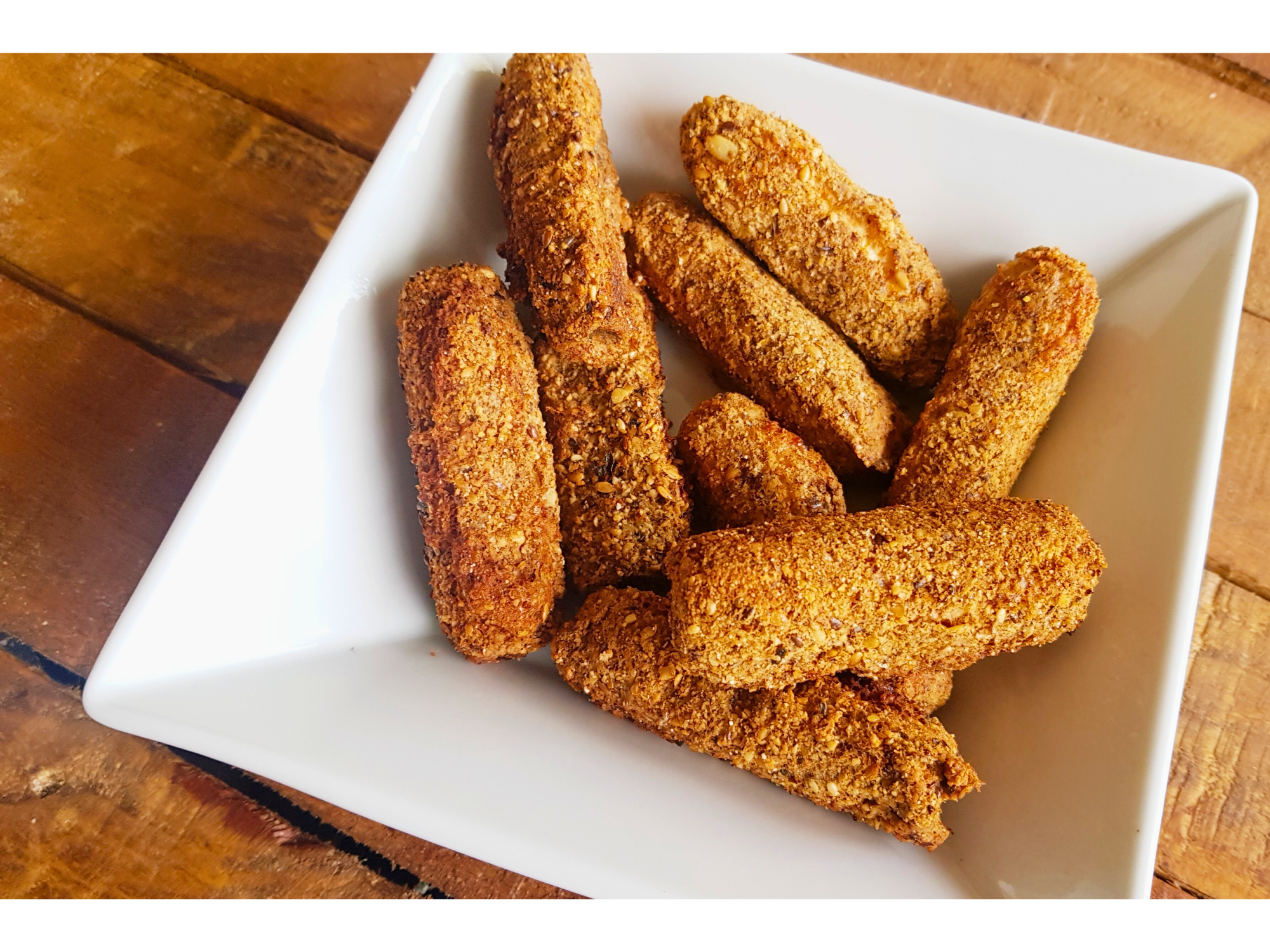 Palitos crocantes en versión keto real, rebozados sin harinas ni ultraprocesados, con rellenos bien sabrosos y acompañados de cheddar para sumarle un extra irresistible.