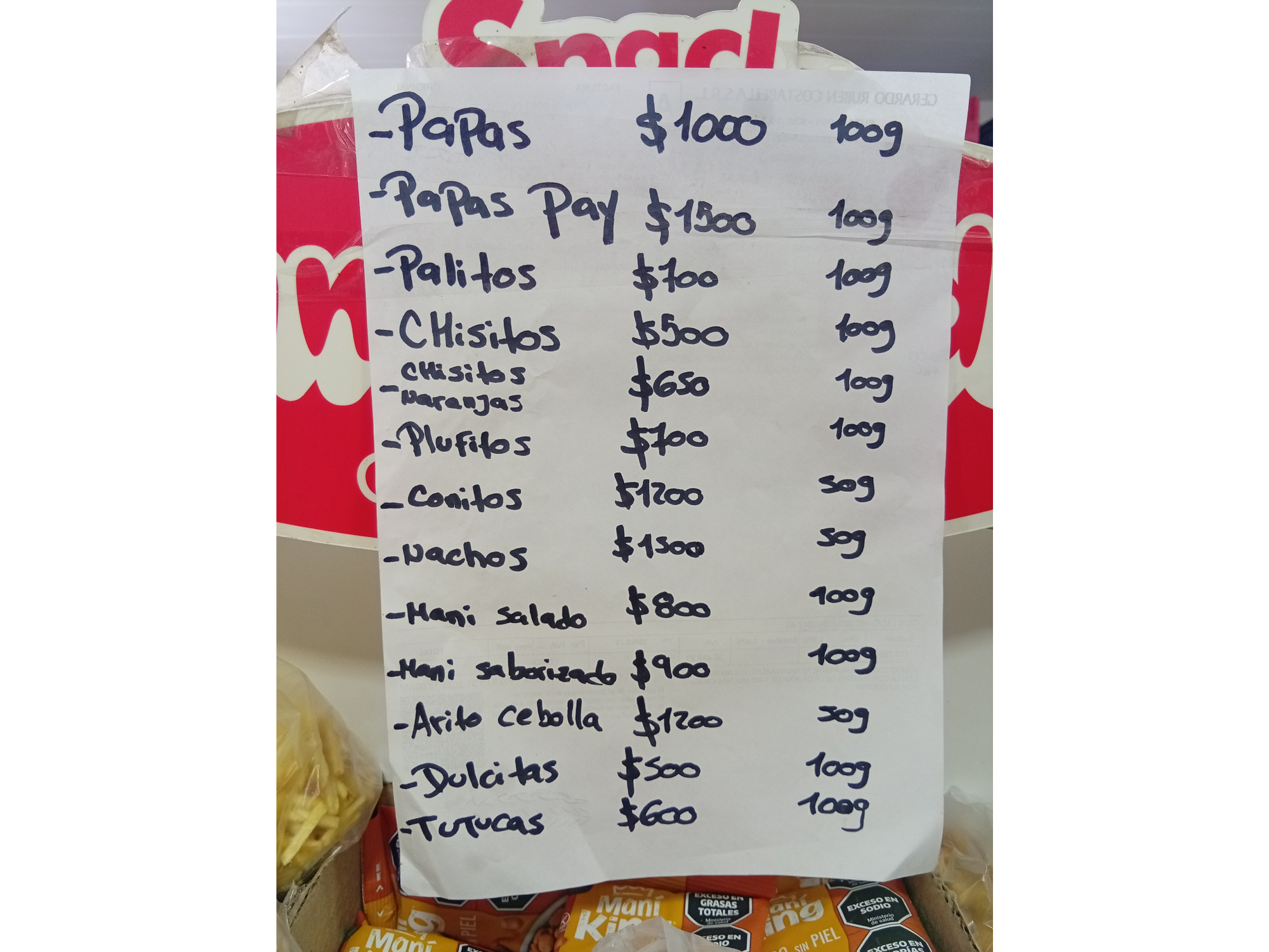 Snacks sueltos Compartir Presentaciones Seleccioná una opción.Chisitos$500Papitas$1.000Tutucas$600Puflitos$700Papas pay$1.500Palitos$700Chisitos Naranja$650Conitos$1.200Nachos$1.500Mani salado$800Mani saborizado$900Arito cebolla$1.200Dulcitas$500 Observaciones 0 / 150