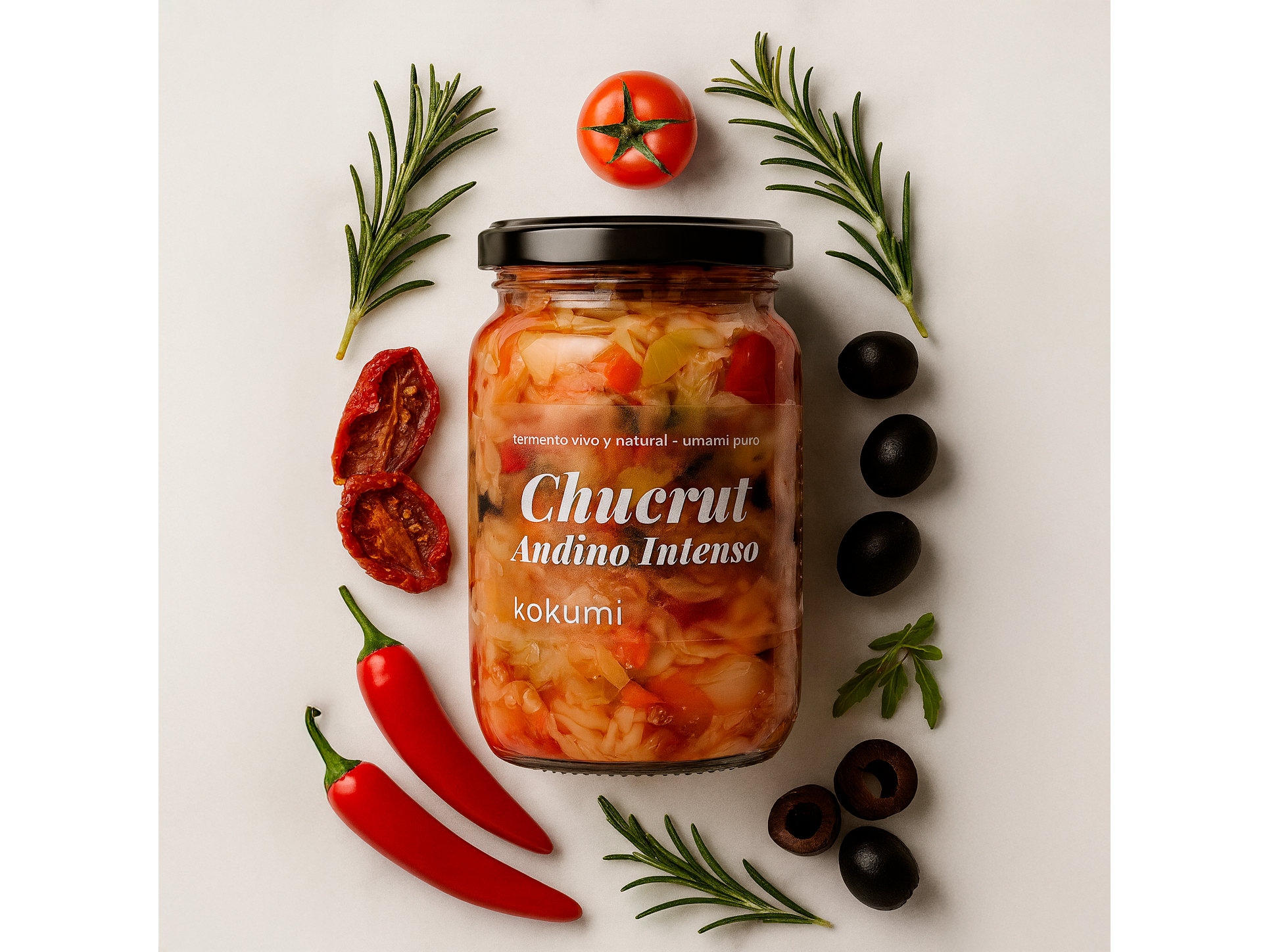 Ingredientes: Repollo blanco fermentado con olivas negras, tomate disecado, un tque de jalapeño y romero fresco. De sabor profundo, intenso y levemente picante.