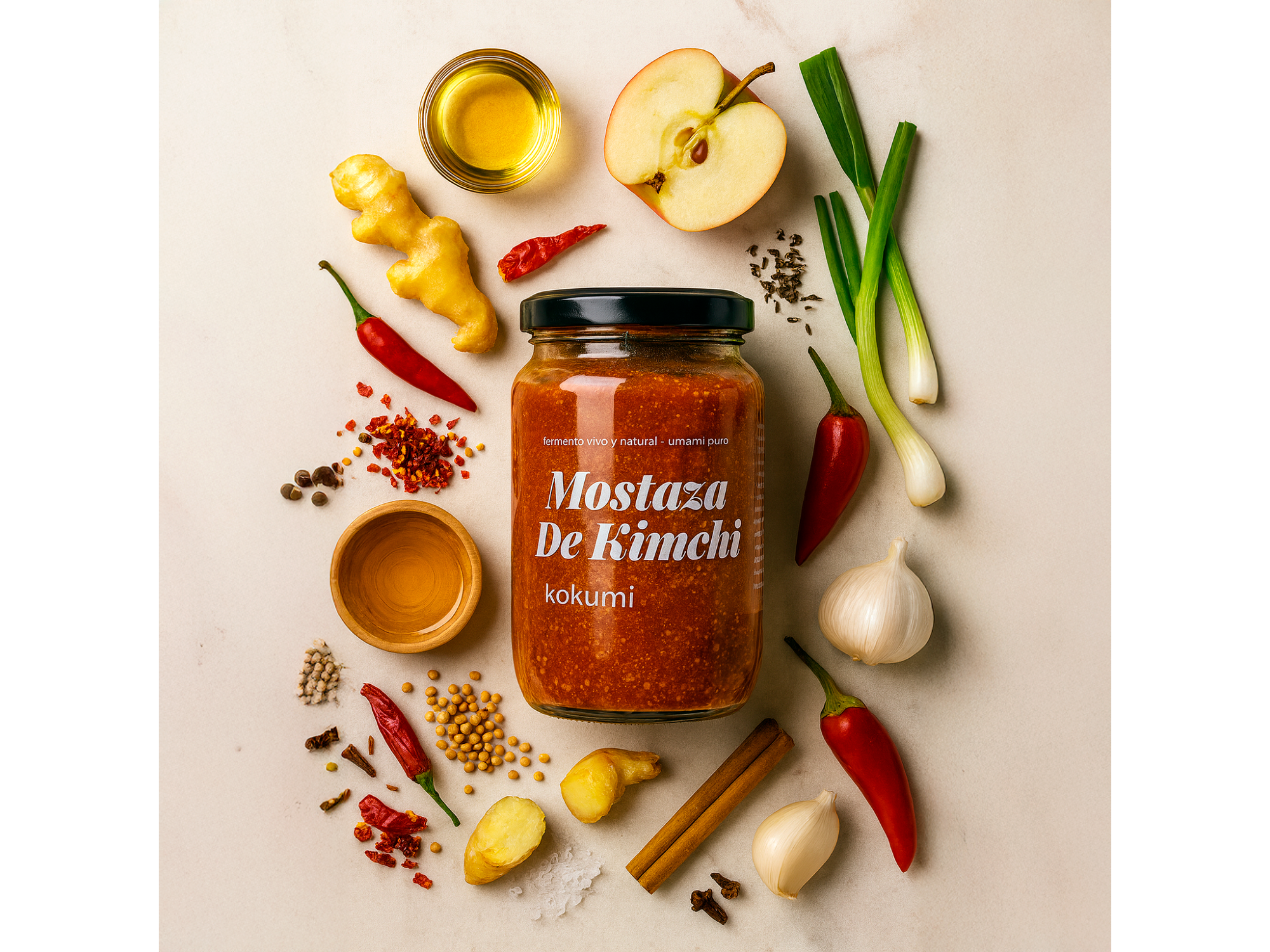 ⭐Receta original de Kokumi: Mostaza en grano, fermentada en salsa de kimchi, miel cruda y vino blanco. Ácida, especiada y con umami suave. Sirve para hacer que todo tenga más gracia: sándwiches, hot dogs, carnes, quesos y cualquier plato que pida un toque intenso-elegante.