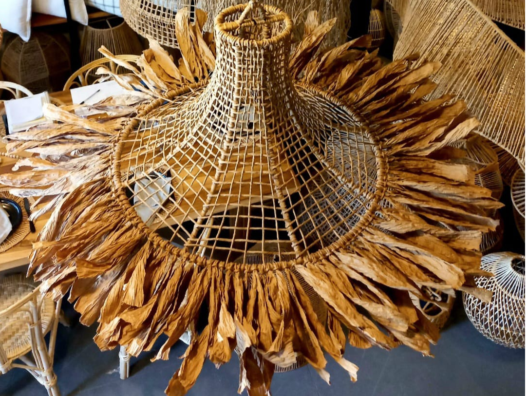 Lámpara Afortunada con una estructura de hierro de 4 mm. Tejida artesanalmente en hilo kraft.