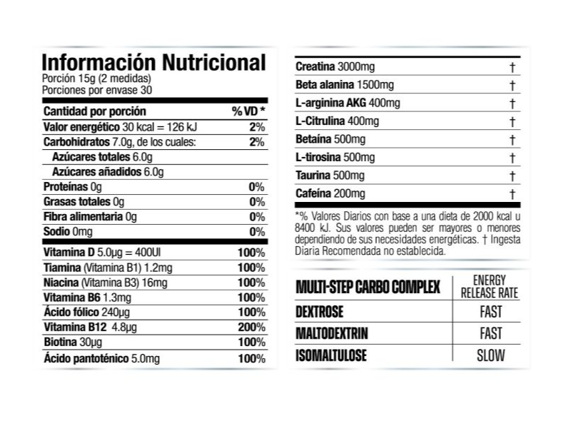 -Multi-step Carbo Complex: Tres fuentes de carbohidratos para aportar energía de liberación inmediata y prolongada, lo que favorece un rendimiento constante durante toda la sesión.