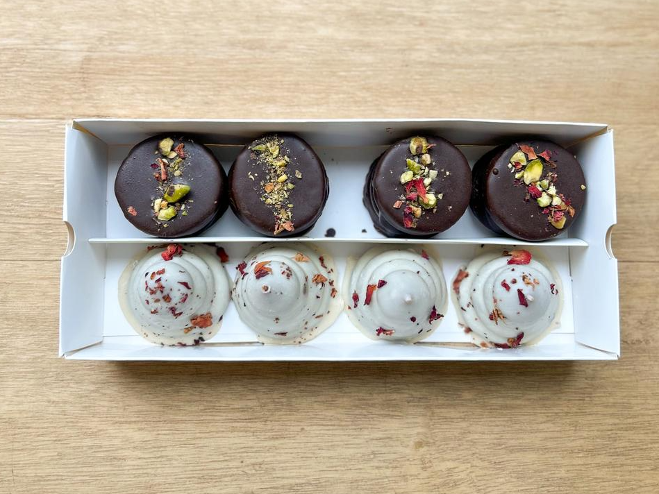 Esta caja incluye: • 4 conitos de dulce de leche bañados de choco blanco. • 4 alfajores de Choco Dubai. *Se pide con anticipación.