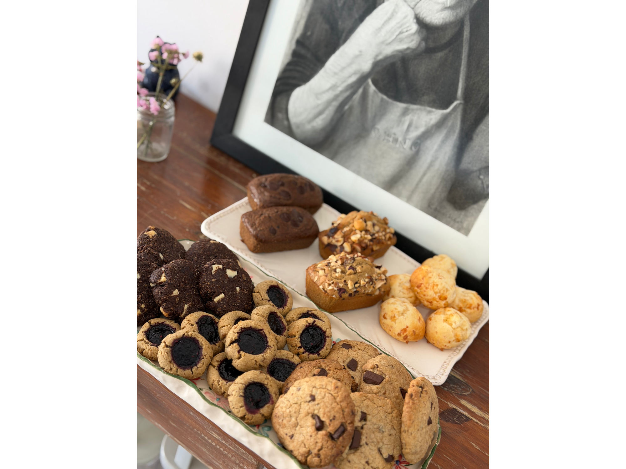 Pack saludable grande. Incluye: 6 cookies con avena y chocolate 70% 6 cookies integrales con avena y cacao. 2 mini budín de vainilla y frutos secos (sin harina de trigo) 2 mini budín de cacao y chocolate belga 70% (sin harina de trigo) 12 pepitas integrales con mermelada de frutos rojos casera reducida en azúcar Opcional: 6 chipa.