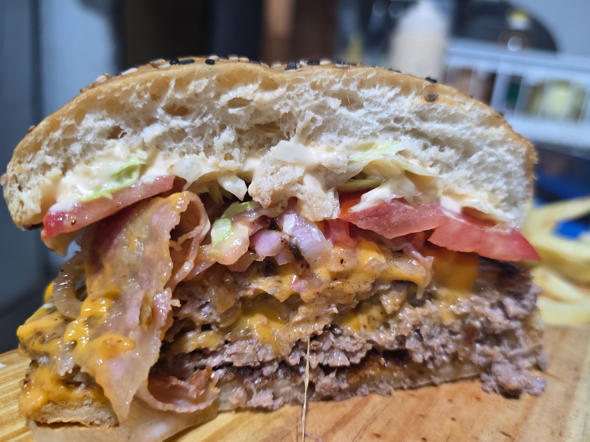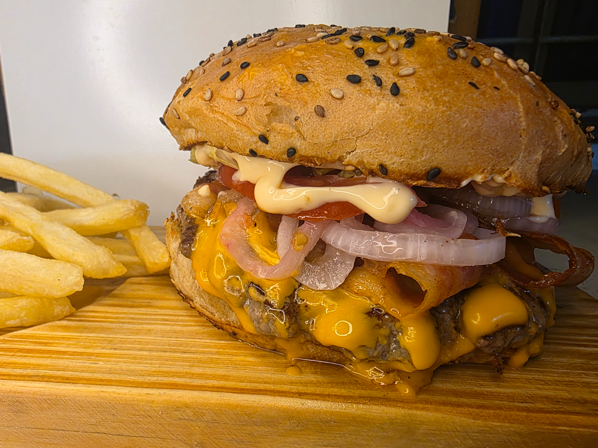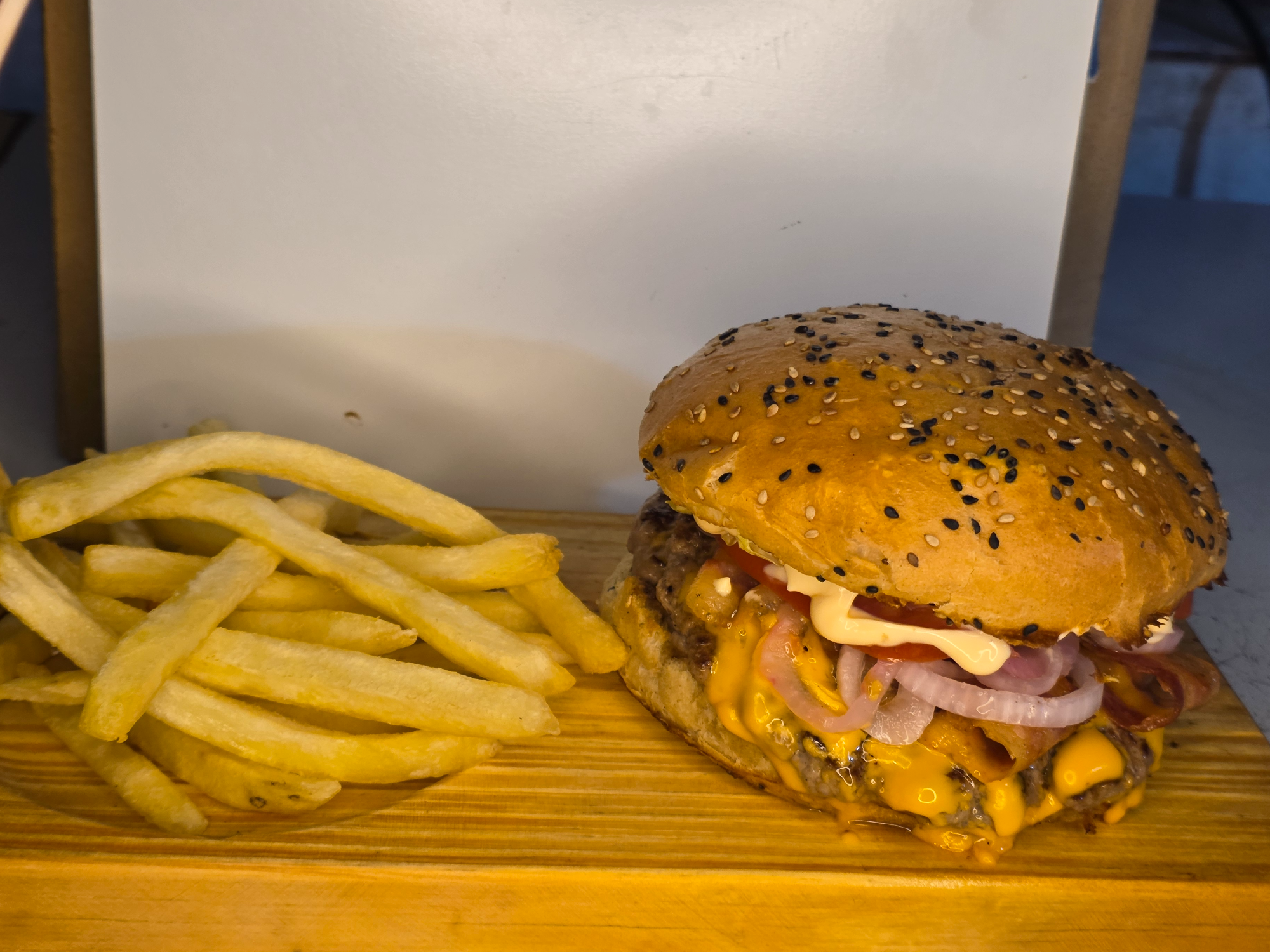 HELLMANN'S BACON Compartir por WhatsApp Copiar enlace Doble Medallon 100% Carne, Salsa Cheddar, Tomate, Lechuga, Mayo Hellmann's Bacon, cebollita morada, Pepinillos y Panceta. + Papas Fritas McCain$12.000$11.000 8% OFF Personalizá tu selección Las siguientes opciones aplican para cada producto agregado. EXTRA p/ BURGERS Seleccioná las opciones que quieras.MEDALLON 120 GRS$2.000PAPAS FRITAS MCCAIN$2.000 TOPPINGS Seleccioná las opciones que quieras.HUEVO$1.000QUESO CHEEDAR$1.000QUESO TYBO$1.000CEBOLLA CARAMELIZADA$500MORRON ASADO$500 Observaciones 0 / 150